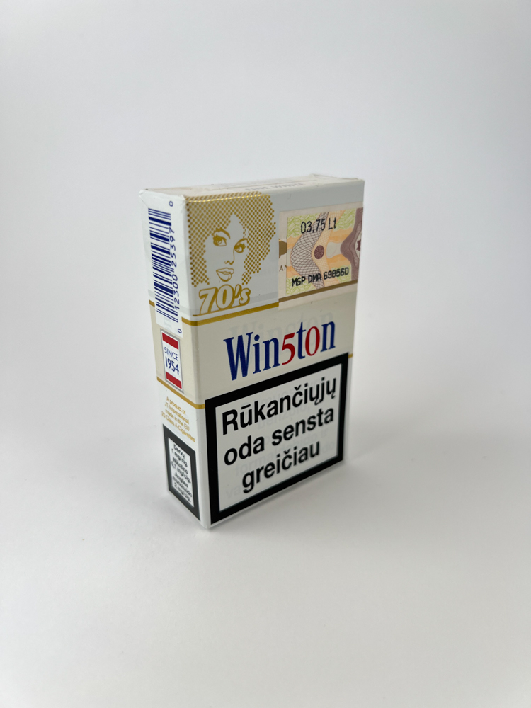 Description: Šis Winston cigarečių leidimas – „Disco fever 70’s“ – priklauso specialiai riboto leidimo serijai, skirtai 1970-ųjų disco kultūros tematikai. Pakelis dekoruotas stilizuota moters veido iliustracija ir auksinės spalvos fonu, pabrėžiančiu nostalgišką dizainą. Išlikęs senas lietuviškas akcizo lipdukas su kaina litais (3,75 Lt) leidžia tiksliai nustatyti pakelio kilmės šalį ir laikotarpį. Įspėjimai apie rūkymo žalą pateikti lietuvių kalba. Pakelis nepažeistas, užplombuotas.