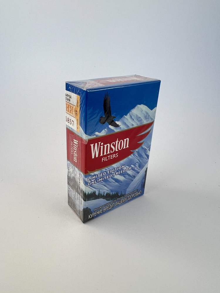 Description: This limited edition Winston Filters pack features a distinctive mountain landscape in the background and the words „LIMITED EDITION – UNLIMITED FREEDOM“. The pack is decorated in bright red at the top, with a flying eagle in front of snowy peaks. This is one of a series of special editions designed to highlight the theme of freedom. Russian language warnings and an excise stamp indicate that the pack was intended for the Russian market.