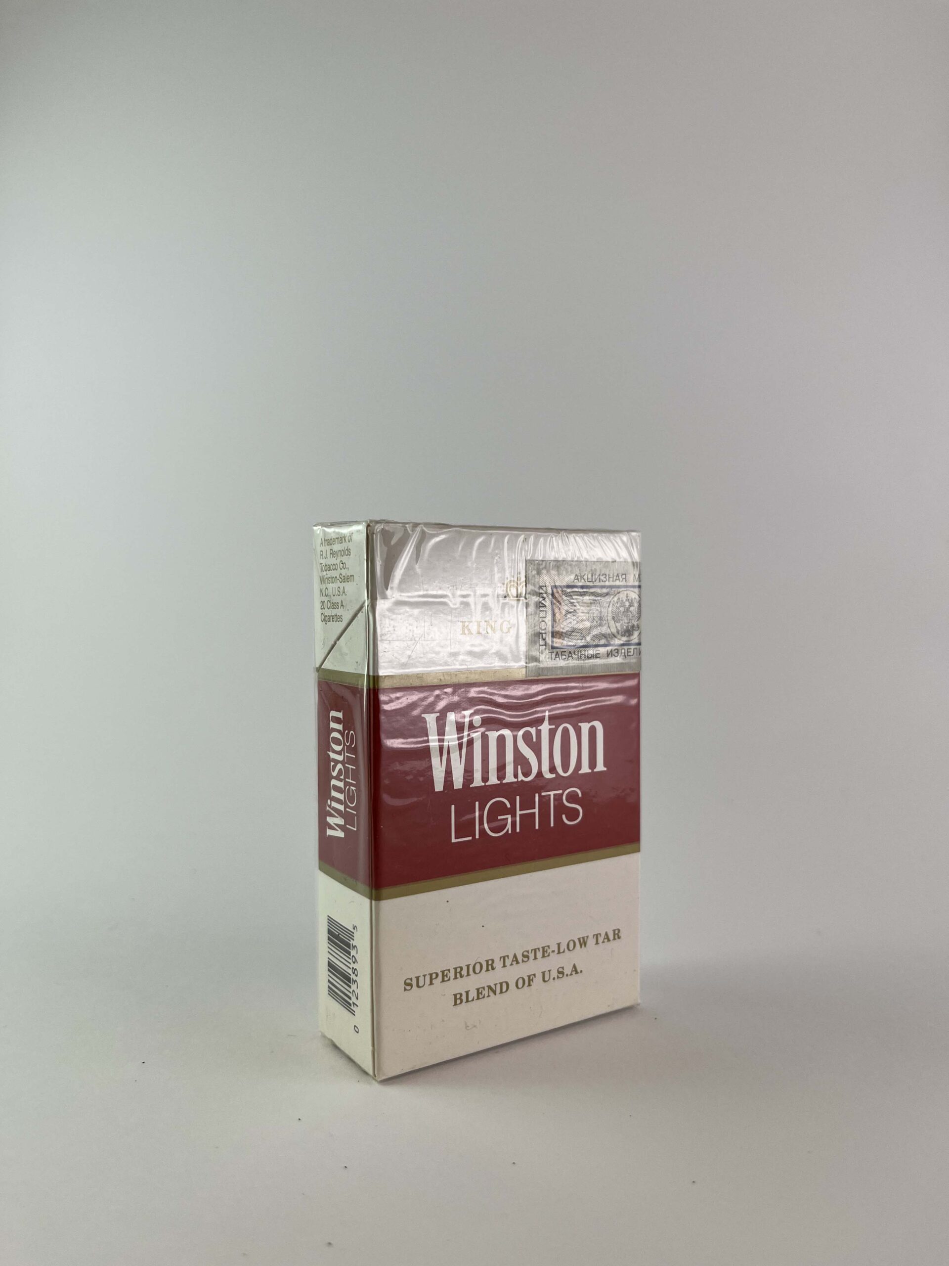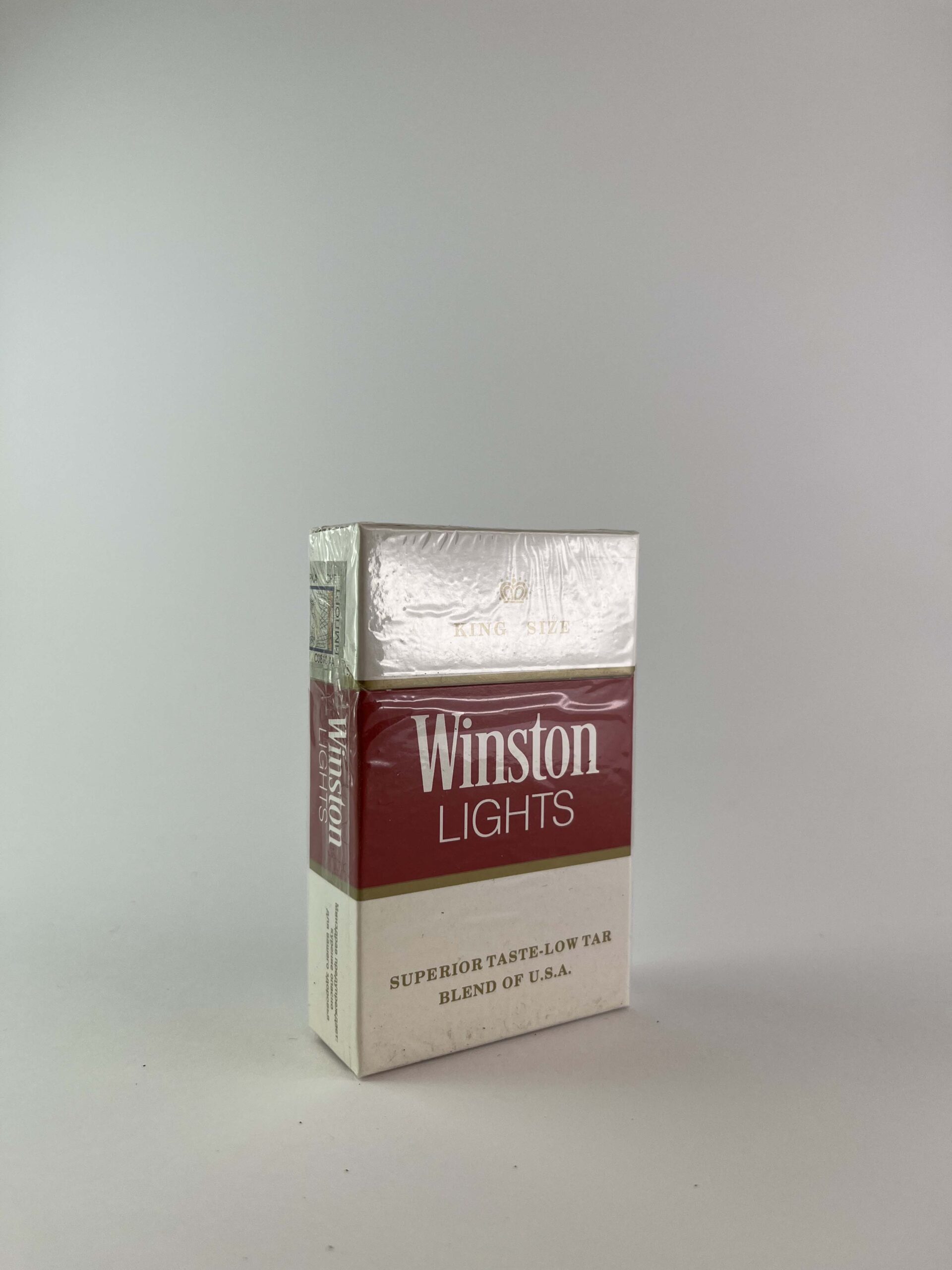 writing: This pack of Winston Lights cigarettes features a classic and subtle design. The combination of white and red with gold accents creates an elegant look. The Winston brand is known for its quality tobacco and subtle flavor. This Lights edition is for those looking for a lower tar content and a lighter flavor.