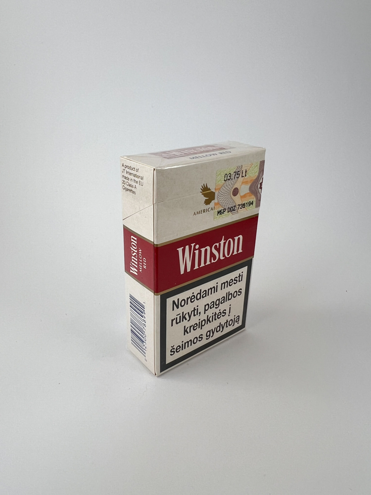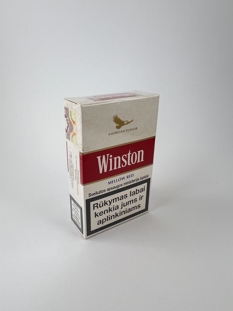 Description: Šis Winston Mellow Red cigarečių pakelis priklauso serijai su užrašu „American Flavor“ ir išsiskiria klasikiniu raudonai baltu dizainu su auksiniu ereliu viršuje. Ant pakelio matomas lietuviškas banderolis su kaina – 3.75 Lt – patvirtina, kad produktas buvo skirtas Lietuvos rinkai prieš įvedant eurą. Ant visų pakelio pusių pateikti įspėjimai apie rūkymo žalą lietuvių kalba. Šis leidimas pasižymi subtiliu retro stiliaus dizainu ir yra įdomus kolekcininkams dėl būklės ir laikotarpio.