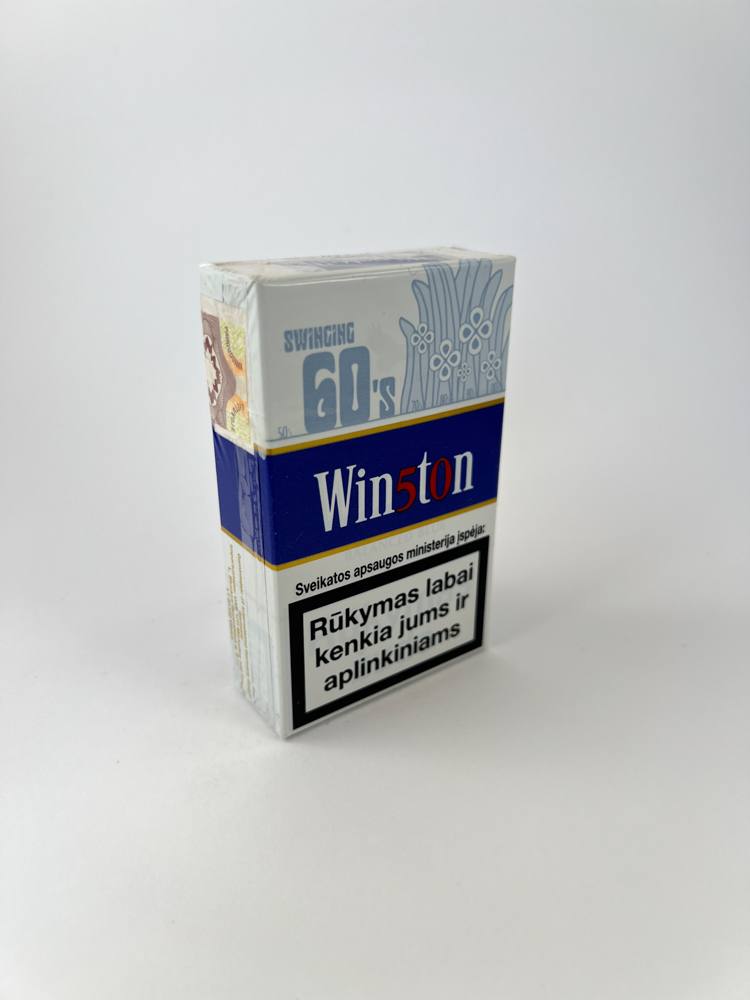 Description: „Winston Swinging 60’s“ – tai riboto leidimo teminis cigarečių pakelis, sukurtas 1960-ųjų stiliaus garbei. Viršutinė dalis puošta stilizuotais gėlių piešiniais ir užrašu „Swinging 60’s“, simbolizuojančiu hipių ir laisvės erą. Apatinė dalis išlaiko klasikinį Winston mėlyną foną su baltu logotipu ir raudona „5“ raide. Priekinėje ir galinėje pusėse – lietuviški sveikatos įspėjimai. Pakelis pažymėtas litų laikų akcizu su 3,75 Lt kaina, išlikusi plėvelė.