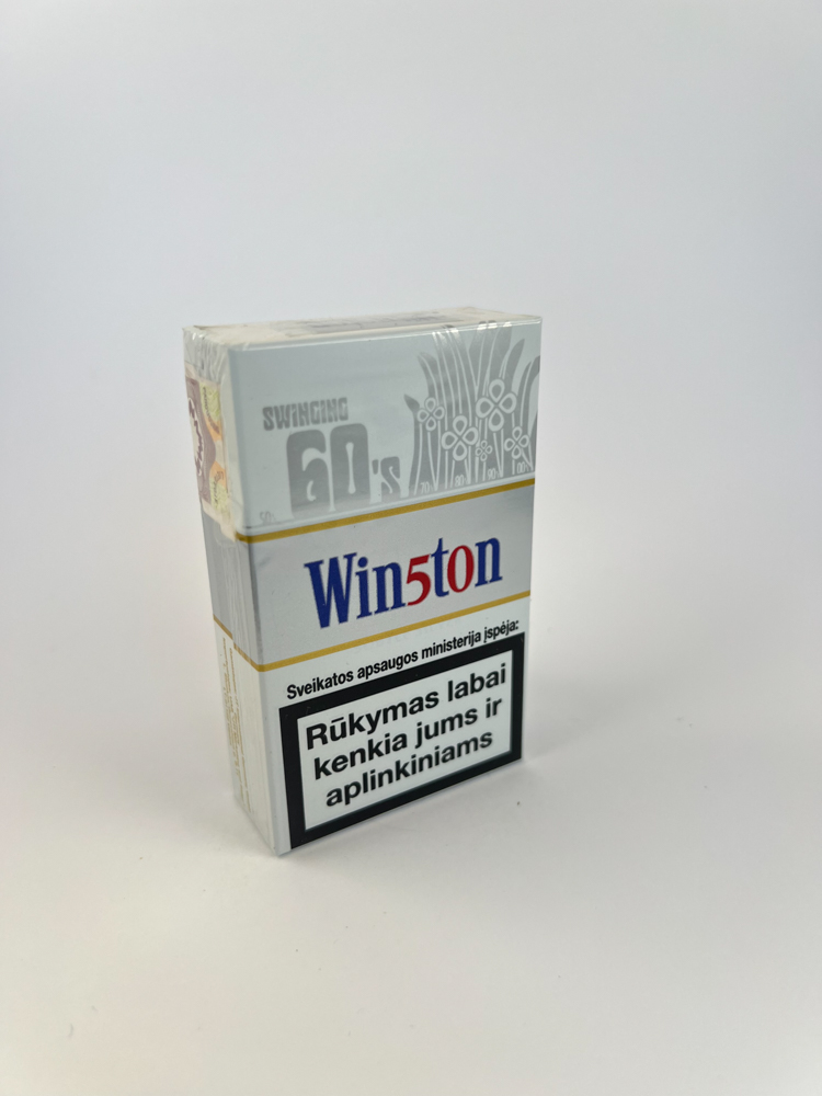 Šis riboto leidimo Winston cigarečių pakelis yra skirtas „Swinging 60’s“ tematikai, simbolizuojančiai 1960-ųjų estetiką. Dominuoja sidabrinės, baltos ir auksinės spalvos su retro stiliaus grafiniais elementais. Pavadinimas „Win5ton” išskiriamas pakeistu skaičiumi „5”, kas suteikia papildomo vizualinio efekto. Įspėjimai apie rūkymo žalą pateikiami lietuvių kalba, o pakelis dar užklijuotas su lietuvišku akcizo ženklu bei kaina – 3,75 Lt, kas patvirtina gamybos ir platinimo laikotarpį Lietuvoje. Pakelis neišpakuotas, išlaikytas puikios būklės.