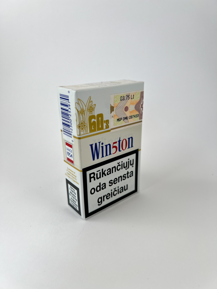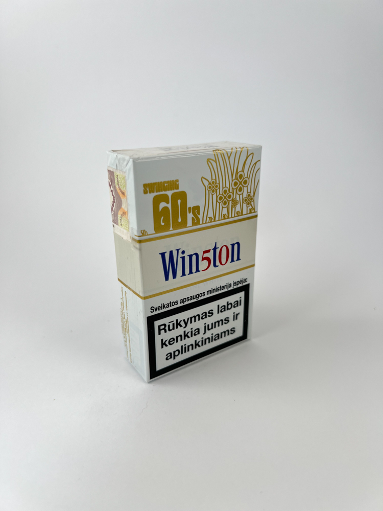 Description: Šis „Winston Swinging 60’s“ cigarečių pakelis – tai riboto leidimo dizainas, įkvėptas 1960-ųjų estetikos. Pakelis dominuoja šviesiomis spalvomis su aukso spalvos grafika viršuje, kurioje pavaizduoti gėlių motyvai, simbolizuojantys hipių laikmetį. „Winston“ logotipas pavaizduotas klasikiniu mėlynos ir raudonos spalvos deriniu, o šone aiškiai matomas užrašas „Since 1954“. Lietuviški įspėjimai ir akcizo ženklas su kaina „03.75 Lt“ bei kodu MSP DMJ 097439 identifikuoja šį leidimą kaip skirtą Lietuvos rinkai.