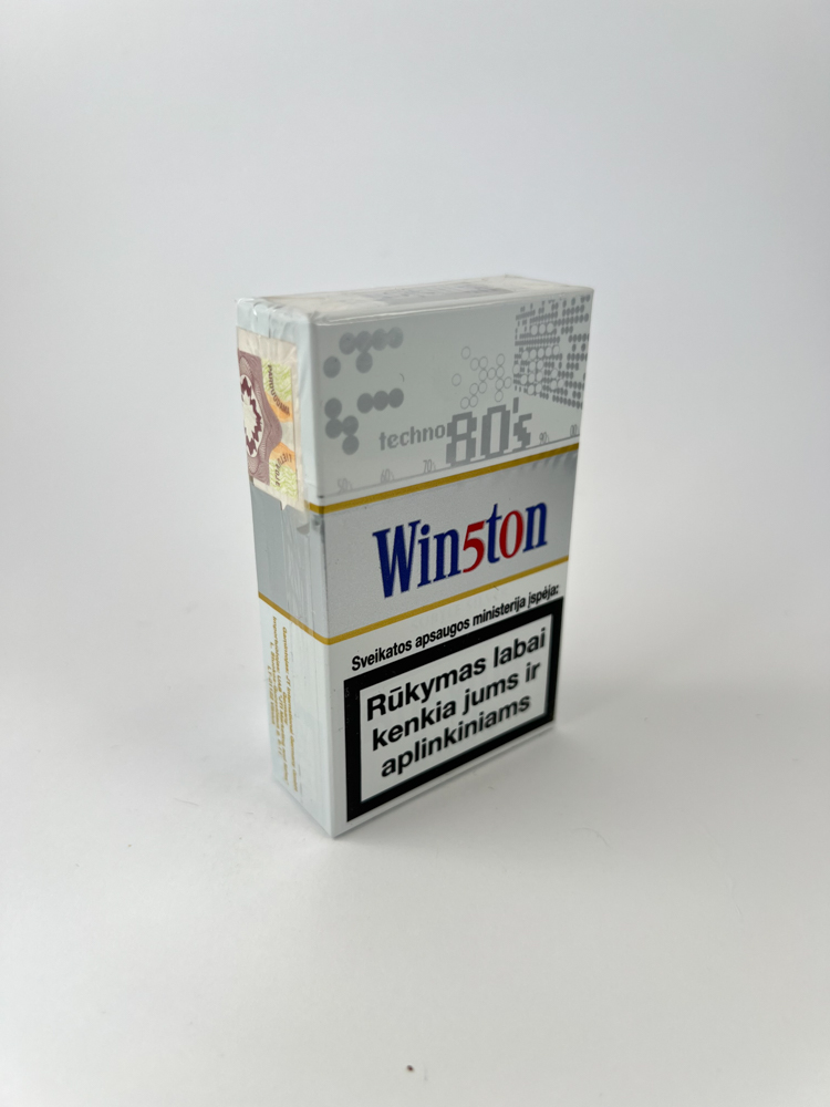 Šis Winston cigarečių pakelis priklauso specialiai „Techno 80’s“ dizaino serijai, išsiskiriančiai pilka spalva ir stilizuotais 1980-ųjų estetika paremtų grafinių elementų motyvais. Logotipas „Win5ton“ naudoja skaitmenį „5“ vietoje „s“, kas yra būdinga šiai serijai. Ant pakelio esantis akcizo ženklas rodo kainą 3,75 Lt, o tai leidžia tiksliau nustatyti leidimo laikotarpį. Įspėjimai apie rūkymo žalą pateikti lietuvių kalba, o pakelio šone pažymėta, jog gaminta ES rinkai.
