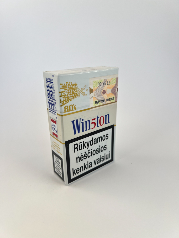 Description: Šis riboto leidimo Winston cigarečių pakelis iš „techno 80’s“ serijos išsiskiria futuristiniu dizainu su auksiniais taškiniais motyvais, primenančiais 8-bit stilių. Priekinėje pusėje esantis „Win5ton“ logotipas naudoja „5“ kaip stilistinį elementą, o įspėjimai pateikti lietuvių kalba. Ant viršaus išlikęs akcizo lipdukas su kaina 3.75 Lt leidžia tiksliai nustatyti laikotarpį prieš euro įvedimą Lietuvoje. Dizainas įkvėptas 1980-ųjų stiliaus, skirtas pabrėžti šio laikmečio nostalgiją.