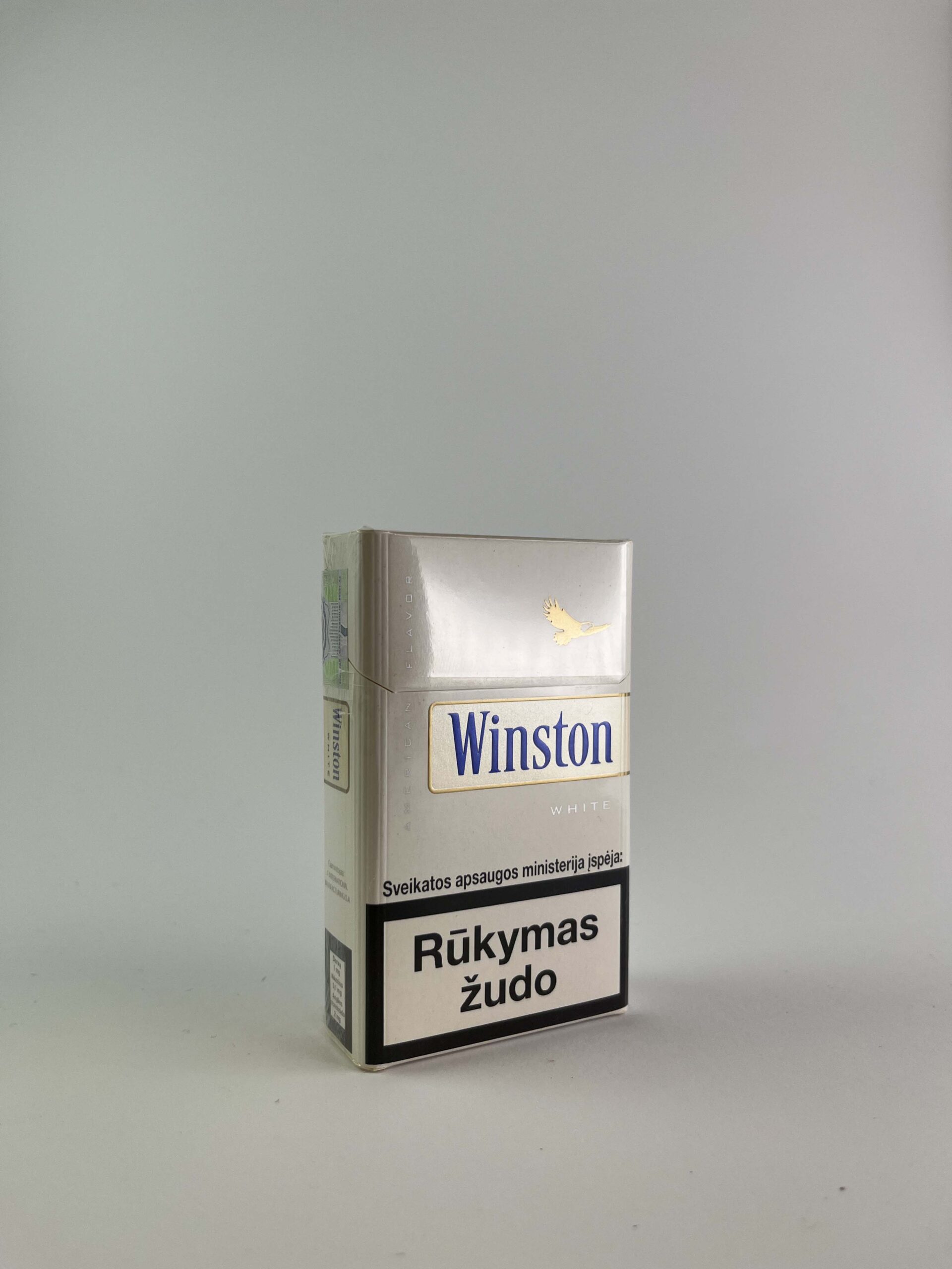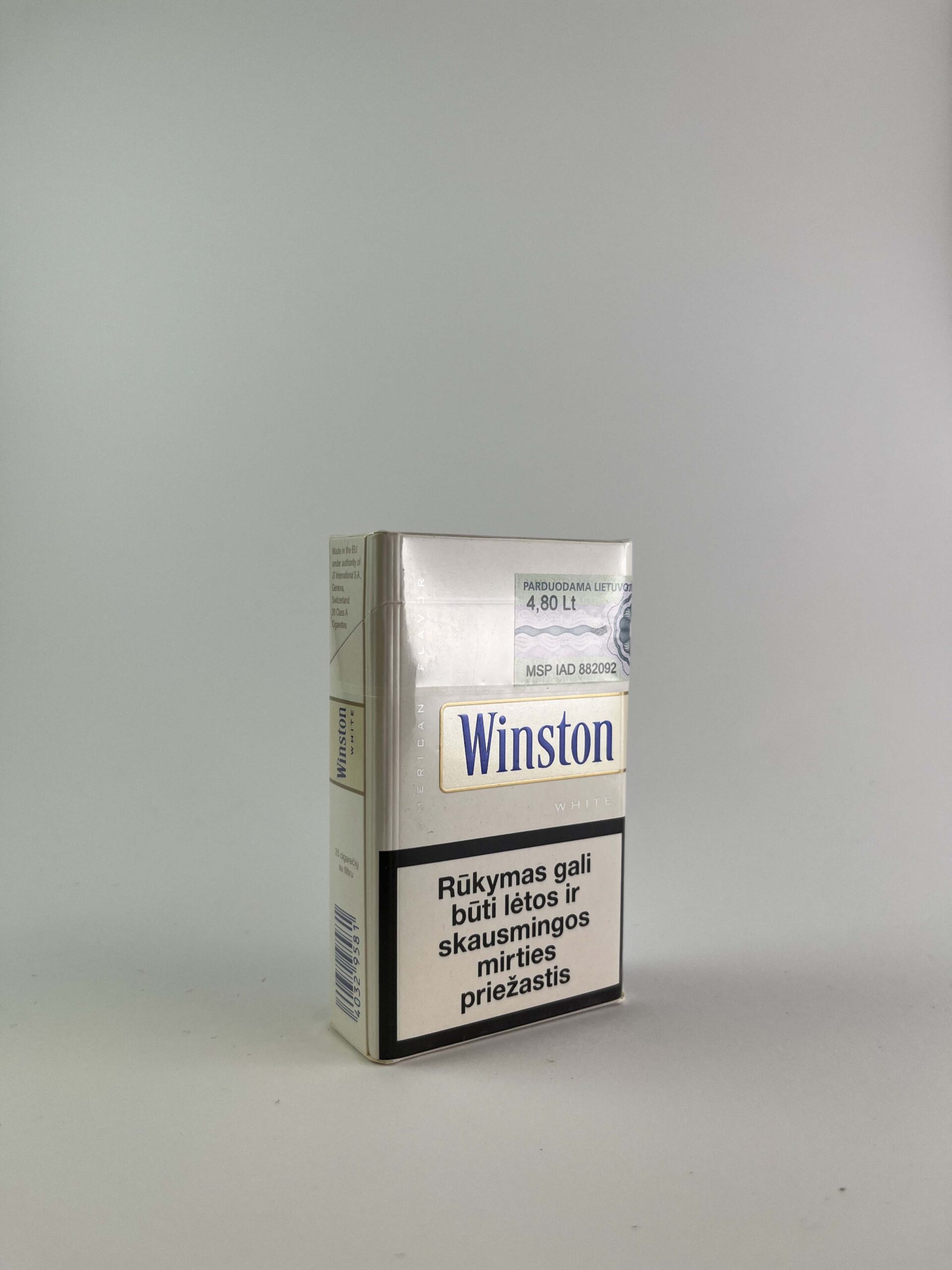 Aprašymas: Šis „Winston White“ cigarečių pakelis pasižymi elegantišku, šviesiu dizainu su balta ir sidabrine spalvų schema. Pakelis turi užrašą „American Flavor“, nurodantį švelnų skonį. Priekinėje ir galinėje pusėse pateikiami sveikatos įspėjimai, o dešinėje pusėje yra Lietuvos banderolė, nurodanti kainą litais – tai rodo, kad šis pakelis buvo skirtas Lietuvos rinkai iki euro įvedimo.