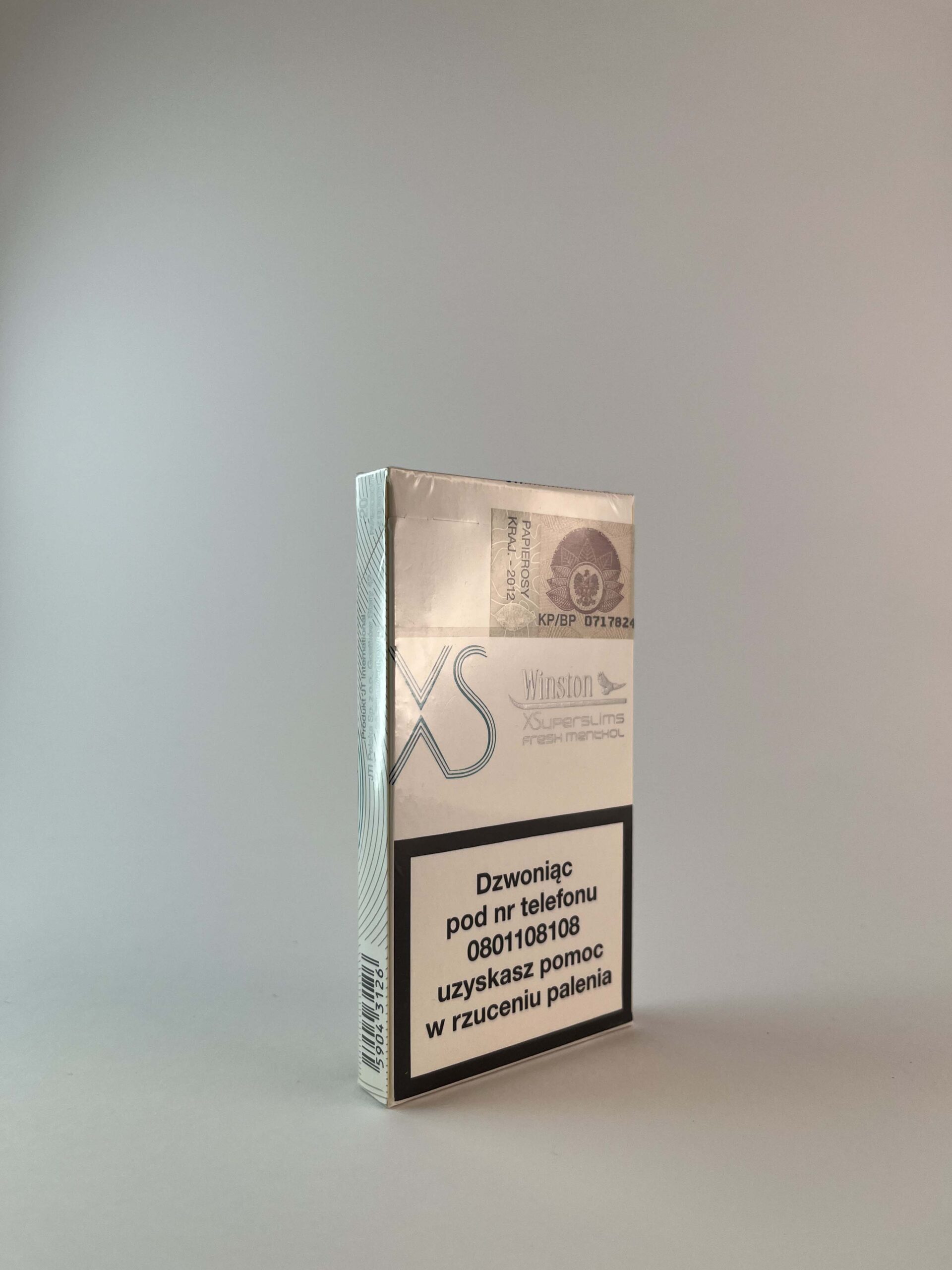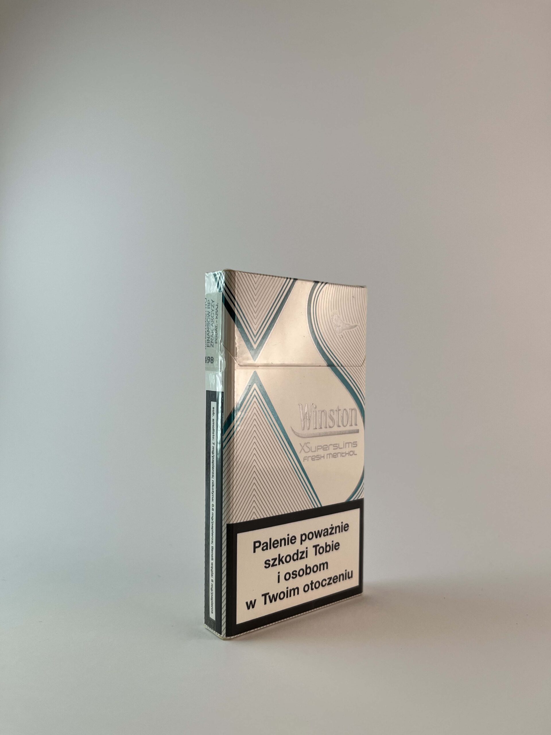 This pack of Winston XS Superslims Fresh Menthol is intended for thin cigarettes ("superslims") with a menthol flavor. The design is modern, light pearlescent with mint lines, corresponding to the image of coolness, cleanliness and freshness. The warnings are presented in Polish, including an invitation to seek help for those who quit smoking, which is typical for the early 2010s. The XS series was aimed at a more female audience and focused on style and elegance.