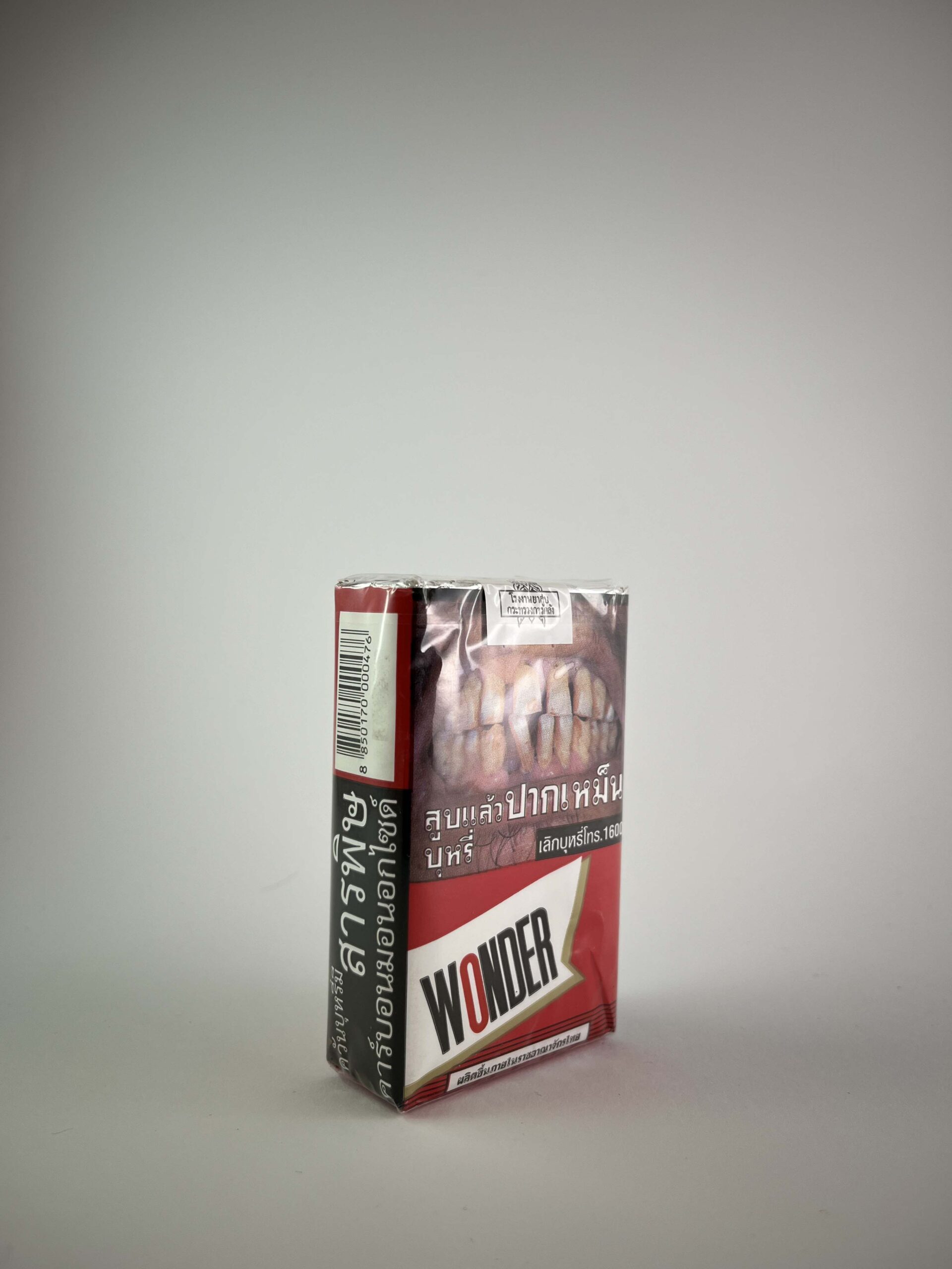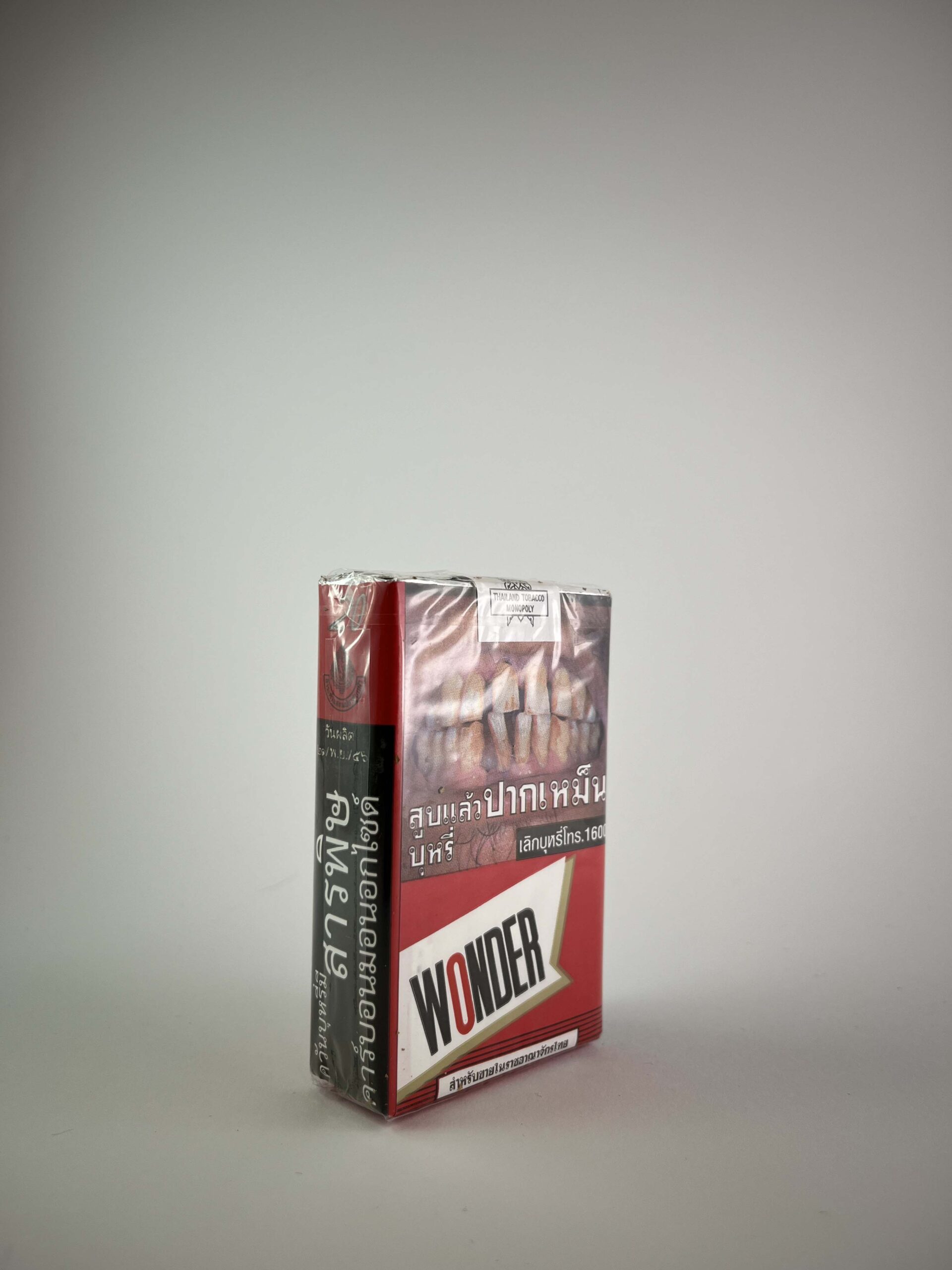 This Wonder cigarette pack features a bold design that combines red and white with a prominent logo and health warning. The pack features a strong graphic health warning about the effects of smoking, including a realistic depiction of dental and oral damage, typical of Thai tobacco packaging. The design is designed to be impactful and informative, while the Wonder element adds a touch of classic brand identity. It is an interesting collector's item due to its regional origin and specific design elements.