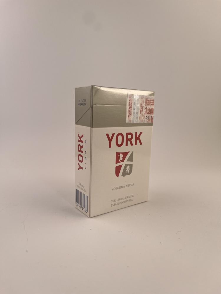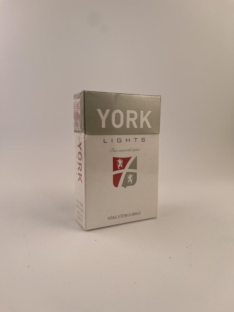 Šviesiai sidabrinis ir baltas YORK Lights variantas – lengvesnė klasikinio YORK cigarečių versija, skirta švelnesnio skonio mėgėjams. Dizainas išlaiko pagrindinius serijos bruožus – minimalistinį stilių, dvikolorį herbą su liūtais ir švarų tipografinį maketą.