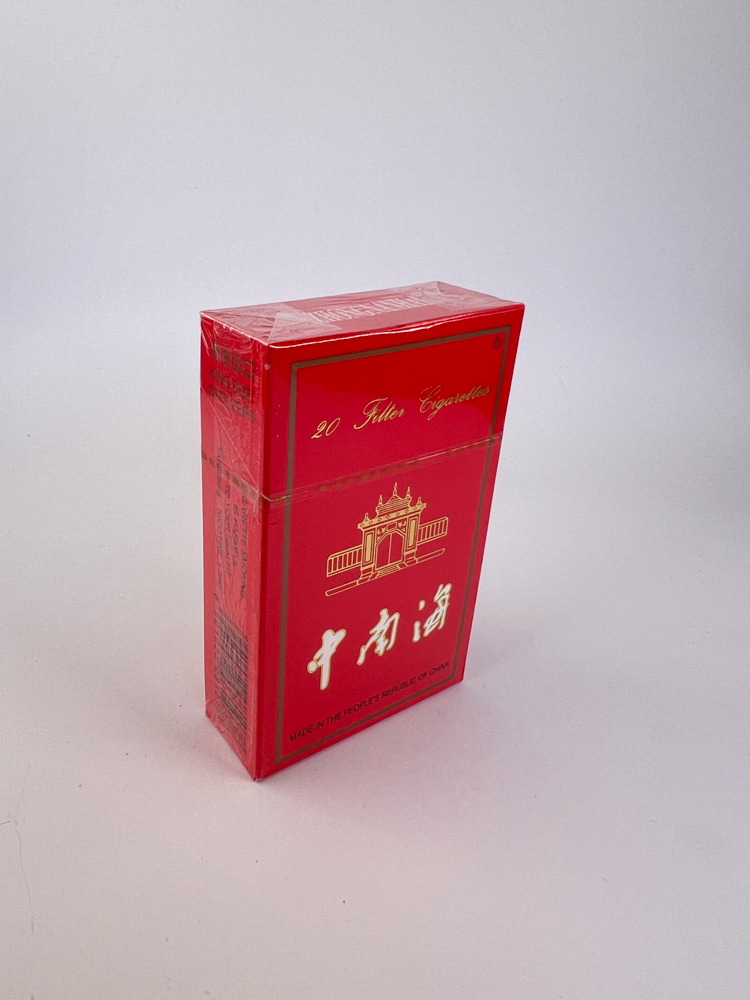 Ryškiai raudonas, klasikinės struktūros pakelis su subtiliu aukso rėmeliu ir aukso spalvos įrašais. Viršutinėje dalyje – užrašas „20 Filter Cigarettes“, centre – Pekino Zhongnanhai komplekso vartų iliustracija, simbolizuojanti Kinijos valstybingumo širdį. Žemiau stambiai įrašytas prekės ženklas „ZHONGNANHAI“. Dizainas pasižymi aiškia hierarchine kompozicija, derinančia nacionalinį simbolizmą ir elegantišką minimalizmą. Raudona ir auksinė spalvos tradiciškai perteikia prestižą, sėkmę bei aukštą socialinį statusą – dažnas motyvas kiniškų cigarečių pakuotėse, skirtose vidaus rinkai.