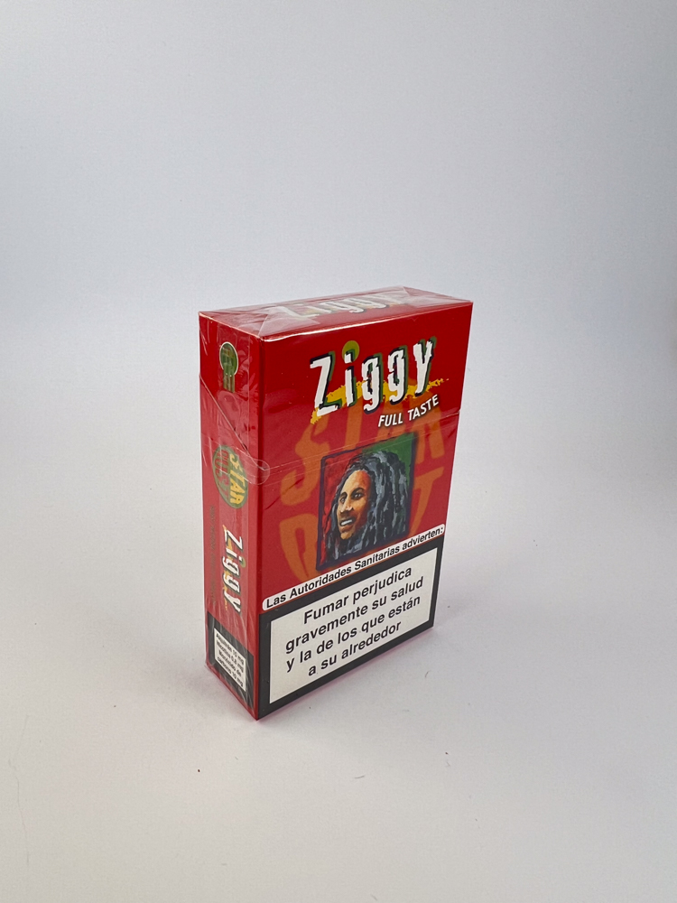 Ziggy "Full Taste" is a bright red design hard pack of cigarettes, clearly standing out from the rest due to its pop culture image. The front side is dominated by a colorful stylized portrait of Ziggy Marley, symbolizing Jamaican culture and the influence of "reggae". Inscription FULL TASTE indicates a stronger tobacco blend, and the packaging's font and colors provide a youthful, informal aesthetic.
