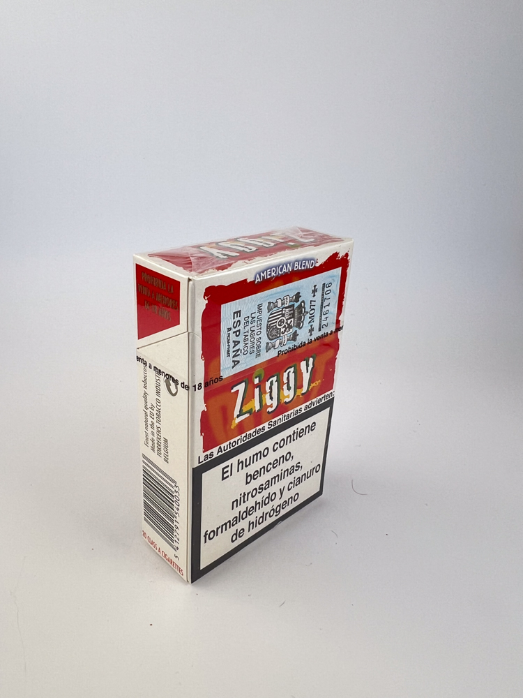 This Ziggy American Blend a pack of cigarettes released for the Spanish market, as indicated by the blue excise sticker with the inscription „"IMPUESTO SOBRE LAS LABORES DEL TABACO - ESPAÑA"“.