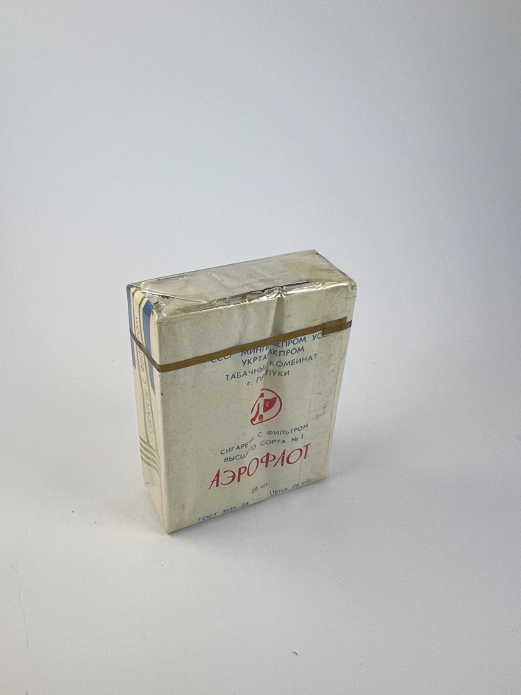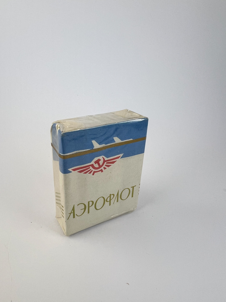 Cigarečių pakelis „Аэрофлот“ yra aiški nuoroda į sovietinę civilinės aviacijos kompaniją „Aeroflot“. Pakelio viršuje dominuoja mėlynas dangus su balto lėktuvo siluetu, o apačioje – legendinis Aerofloto logotipas su pjautuvu ir sparnais, bei pavadinimas „Аэрофлот“. Kitoje pusėje nurodyta, kad pakelis gamintas Ukrainos TSR, Luki tabako kombinate. Dizainas išlaikytas oficialus ir simboliškas – šis pakelis tikėtina buvo skirtas keliaujantiems keleiviams ar avialinijų reklaminiam naudojimui.