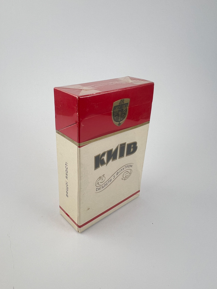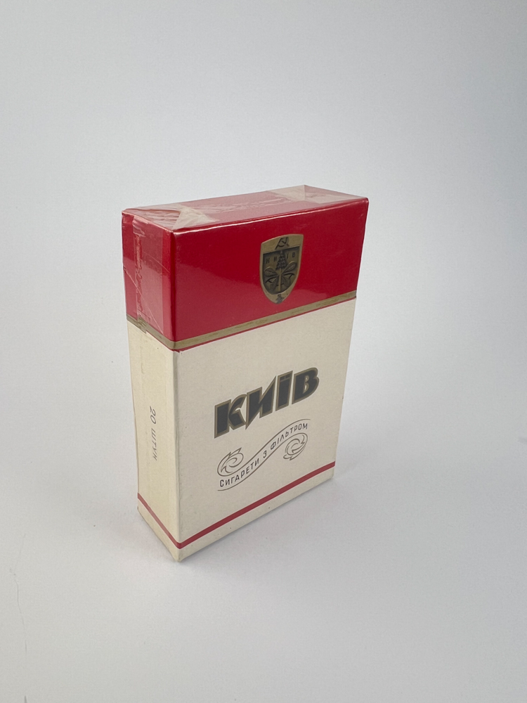 Kyiv (Київ) cigarečių pakelis pasižymi klasikiniu sovietmečio dizainu – dominuoja raudonos ir kreminės spalvos kontrastas, o viršutinėje dalyje matomas herbas su miesto simbolika. Užrašai ant pakelio pateikti ukrainiečių ir rusų kalbomis, nurodant, kad gamyba vyko dar iki Sovietų Sąjungos subyrėjimo. Pakelis kietas, originalioje plėvelėje, išlaikęs nostalgišką estetiką. Tai reprezentatyvus pavyzdys vėlyvojo SSRS laikotarpio tabako gaminių kultūros.