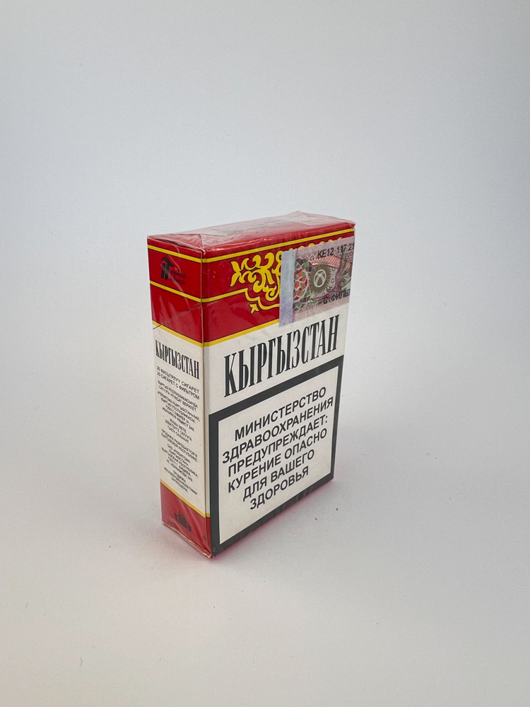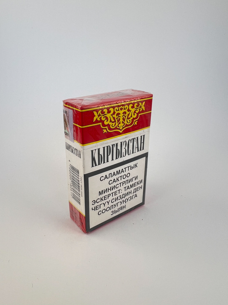 Šis cigarečių pakelis „Кыргызстан“ (Kirgizija) yra nacionalinio dizaino pavyzdys, kurį puošia tradiciniai raudoni ir aukso ornamentai viršutinėje dalyje, simbolizuojantys kirgizų kultūros elementus. Įspėjimai apie rūkymo žalą pateikti tiek kirgizų, tiek rusų kalbomis. Ant pakelio taip pat matomas Kirgizijos akcizo ženklas, patvirtinantis vietinę gamybą ir prekybą. Šoninėse pusėse pateikti techniniai duomenys apie dervų, nikotino ir CO kiekį, atitinkantys buvusio NVS regiono standartus.