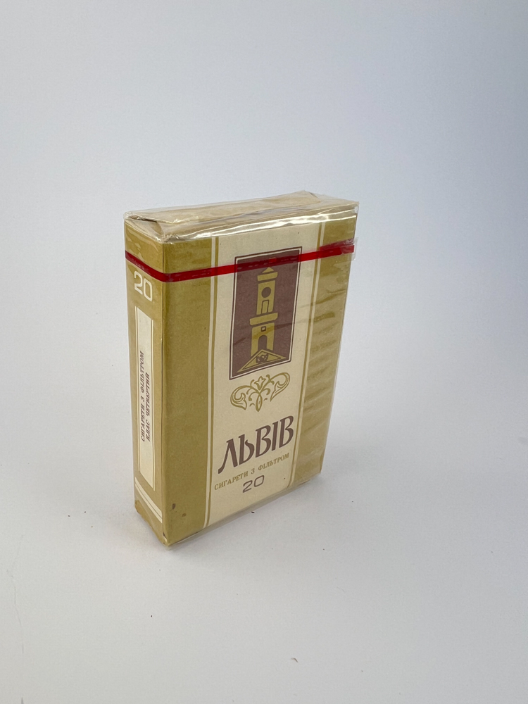 Aprašymas: Cigarečių pakelis „Львів“ išsiskiria šviesiai auksiniu fonu ir minimalistiniu, bet elegantišku dizainu. Centre vaizduojamas stilizuotas Lvivo bokšto simbolis rudame fone, o žemiau užrašas ukrainiečių kalba „Сигарети з фільтром“. Šoninėse pusėse pažymėtas kiekis – 20 vienetų. Dizainas santūrus, su nedideliu dekoratyviniu motyvu po simboliu. Pakelis išsaugotas originalioje skaidrioje plėvelėje, nesutrintas.