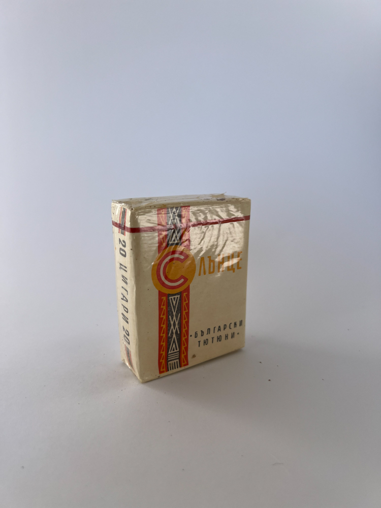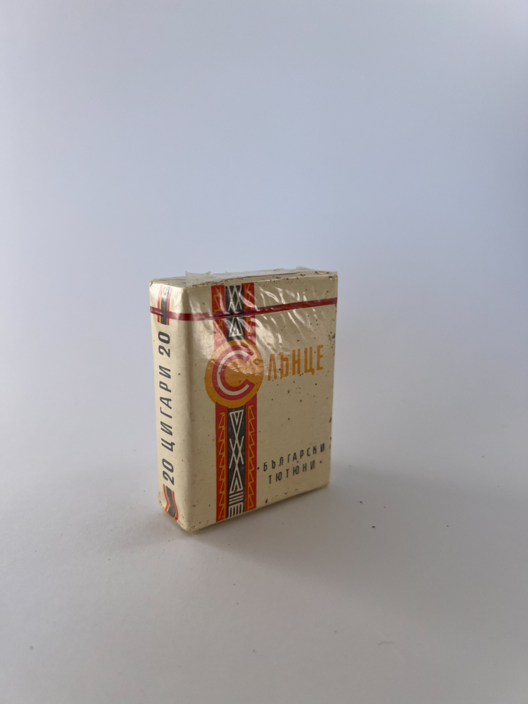 Aprašymas: „Слънце“ (liet. „Saulė“) – tai bulgariškas cigarečių pakelis, pasižymintis ryškiu, saulės motyvuotu dizainu. Pakuotės priekyje dominuoja geltonos ir oranžinės spalvos, simbolizuojančios saulę ir šilumą. Viršutinėje dalyje matomas prekės ženklo pavadinimas kirilica, o apačioje – gamintojo logotipas. Pakelio dizainas atspindi 8-ojo dešimtmečio pabaigos – 9-ojo dešimtmečio pradžios estetiką, būdingą Bulgarijos tabako gaminiams.
