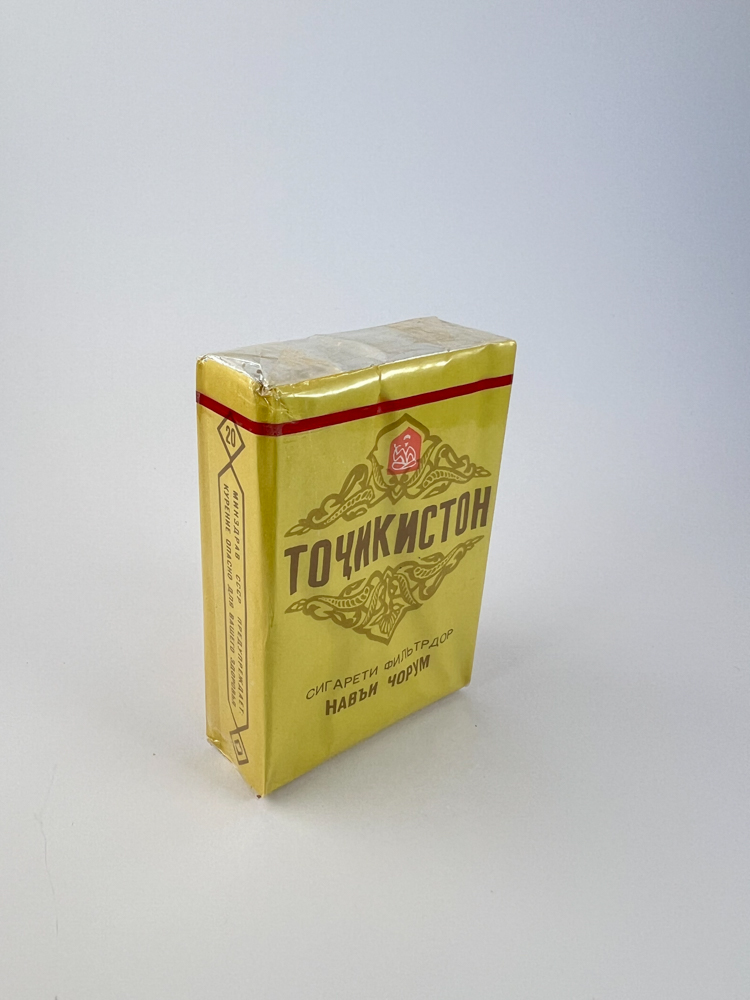 Aprašymas: Šis sovietinis cigarečių pakelis iš Tadžikijos TSR pasižymi auksiniu fonu ir rudais tradiciniais Tadžikistano ornamentais. Ant vienos pusės užrašyta rusiškai „ТАДЖИКИСТАН“, o ant kitos – tadžikiškai „ТОЧИКИСТОН“. Virš pavadinimo – stilizuotas logotipas raudoname fone, būdingas SSRS laikmečio stiliui. Pakelis dekoruotas subtilia raudona linija ties viršutiniu kraštu, o jo dizainas atspindi regioninį identitetą bei to laikmečio estetiką. Cigarečių klasė pažymėta kaip „Класс четвёртый“, t. y. ketvirtoji klasė.