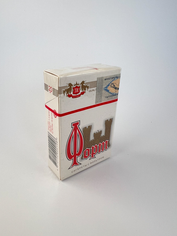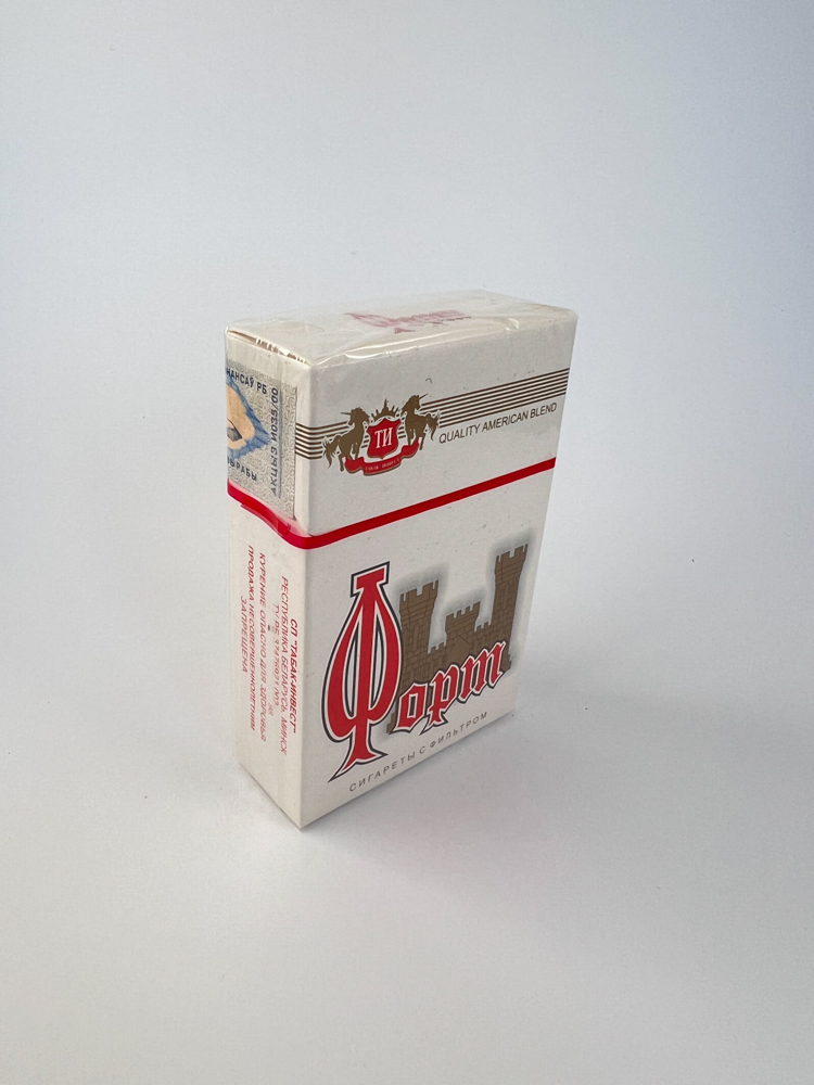 Aprašymas: „Форт“ cigarečių pakelis pasižymi baltu fonu su ryškiu raudonu logotipu ir viduramžių tvirtovės iliustracija. Viršutinėje dalyje pažymėtas „Quality American Blend“ užrašas, o centre dominuoja stilizuotas cyrilica parašytas „Форт“ pavadinimas. Pakelis klasikinio stiliaus, su raudona juostele per centrą, tipiškas posovietinio laikotarpio dizainas. Akcizinė žyma rodo Ukrainos kilmę, nurodyta gamintojo santrumpa ТИ (Табак-Инвест). Dizainas minimalus, tačiau išskirtinis dėl savo simbolikos.