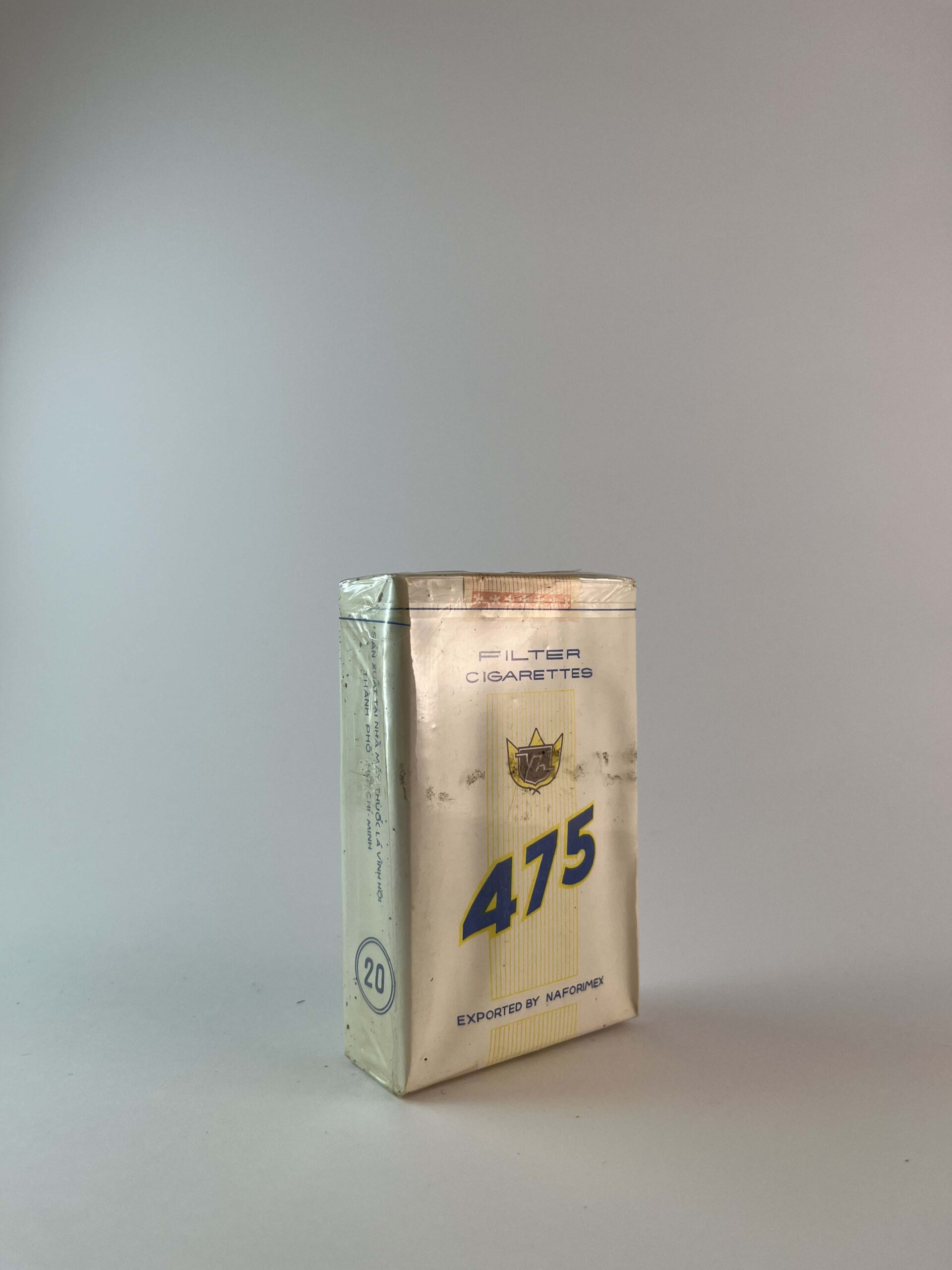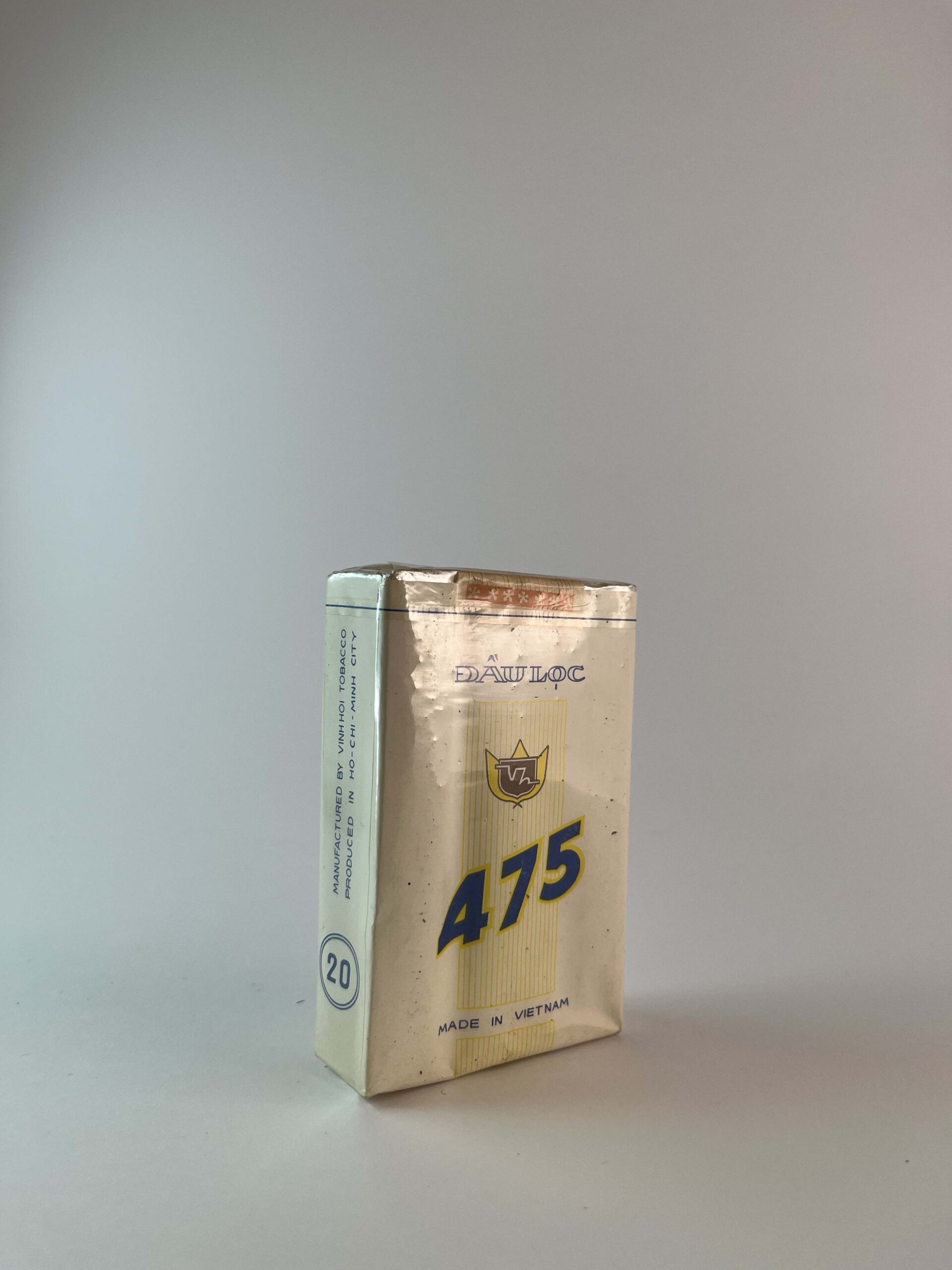 Aprašymas: Đầu Lọc 475 cigarečių pakelis turi paprastą ir klasikinį dizainą, kuris gali atspindėti senesnę gamybos estetiką. Pakuotė yra šviesiai kreminės spalvos su mėlynais ir geltonais akcentais. Centrinėje dalyje esantis skaičius „475“ bei Vietnamo tabako pramonės logotipas suteikia pakeliui atpažįstamą vietinį charakterį. Ant pakuotės taip pat nurodyta „Exported by NAFORMEX“, kas rodo, kad šis produktas buvo skirtas eksportui. Šis dizainas ir autentiškas Vietnamo prekės ženklas gali būti patrauklus kolekcininkams, ieškantiems Azijos tabako produktų.
