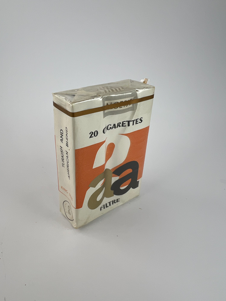Aprašymas: Šis AA Filter cigarečių pakelis išsiskiria minimalistiniu retro stiliaus dizainu, kuriame vyrauja baltas fonas su oranžiniu stačiakampiu ir stambiais grafiškais „aa“ inicialais. Užrašai pateikti tiek arabų, tiek anglų kalbomis, taip pat nurodoma, kad tabako mišinys yra „Turkish and American blend“. Ant viršaus ir šonų yra užrašas „Algerie“, liudijantis gamybos šalį. Tai tipiškas XX a. 8-ojo dešimtmečio pakelis iš Šiaurės Afrikos.