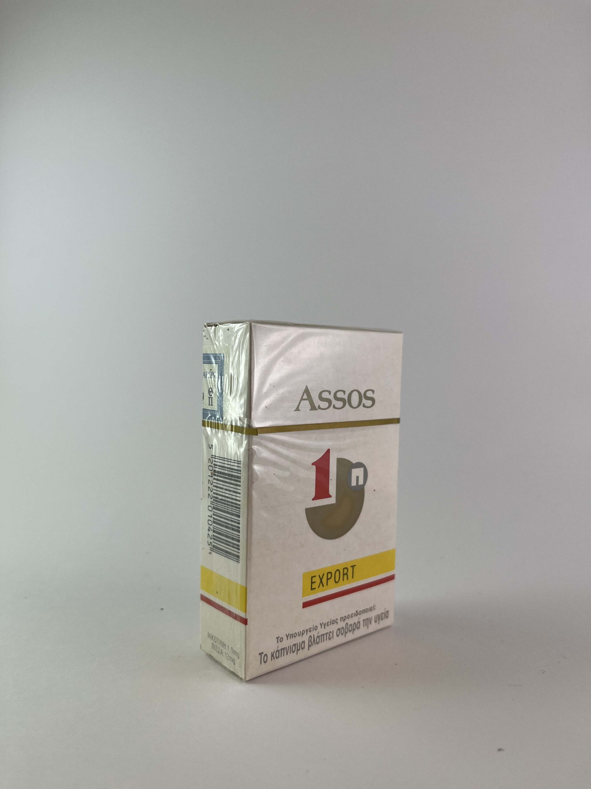 Aprašymas: Šis „Assos Export” cigarečių pakelis yra elegantiškas ir paprasto dizaino, su baltos spalvos dominuojančiu fonu, papildytu auksinėmis ir geltonomis detalėmis. Pakelio dizainas perteikia klasikinį ir praktišką stilių, būdingą to meto tarptautinėms cigaretėms. Įspėjimas apie rūkymo žalą yra aiškiai matomas, nurodant Graikijos rinką kaip pagrindinę šio produkto paskirtį.