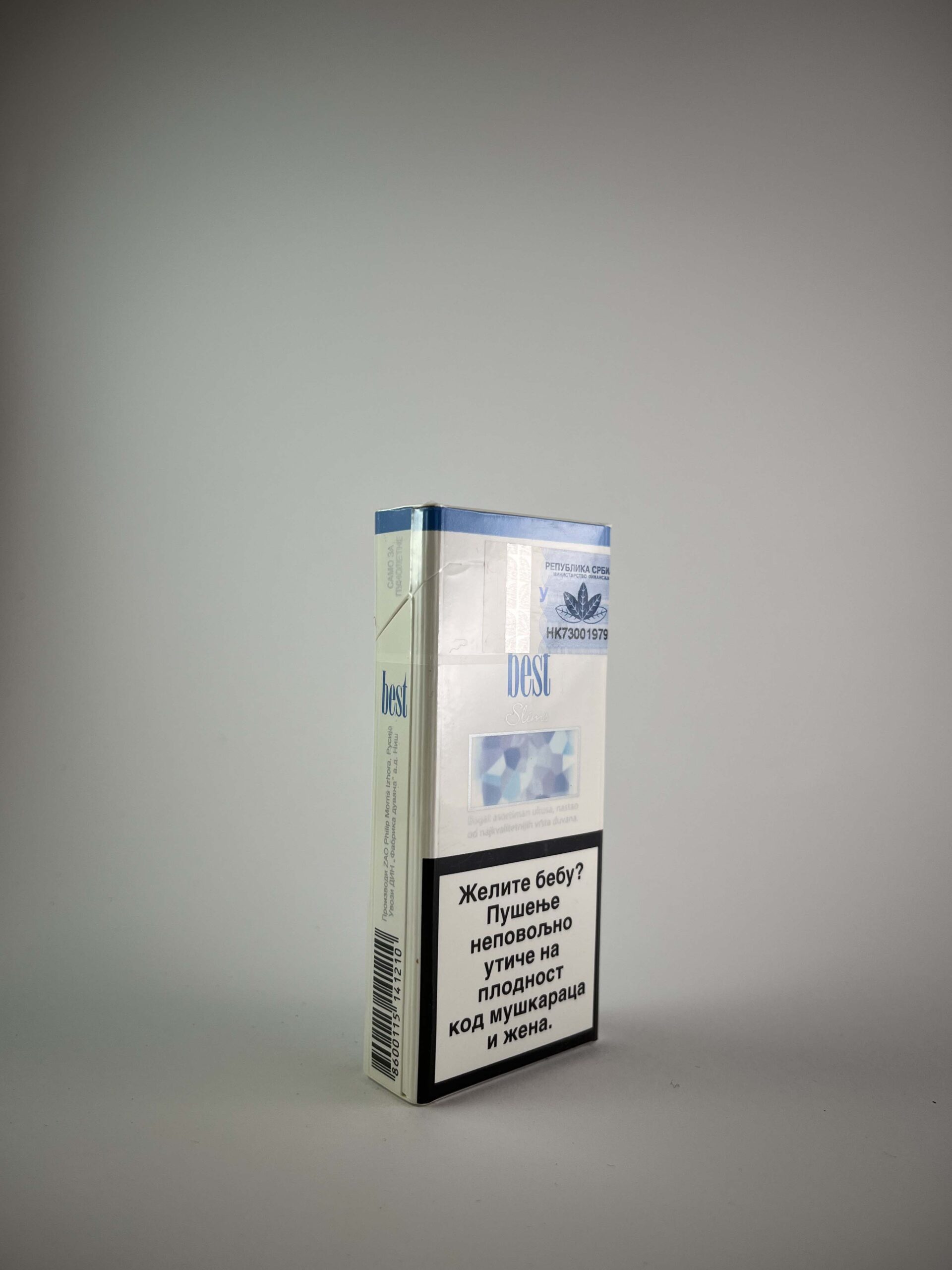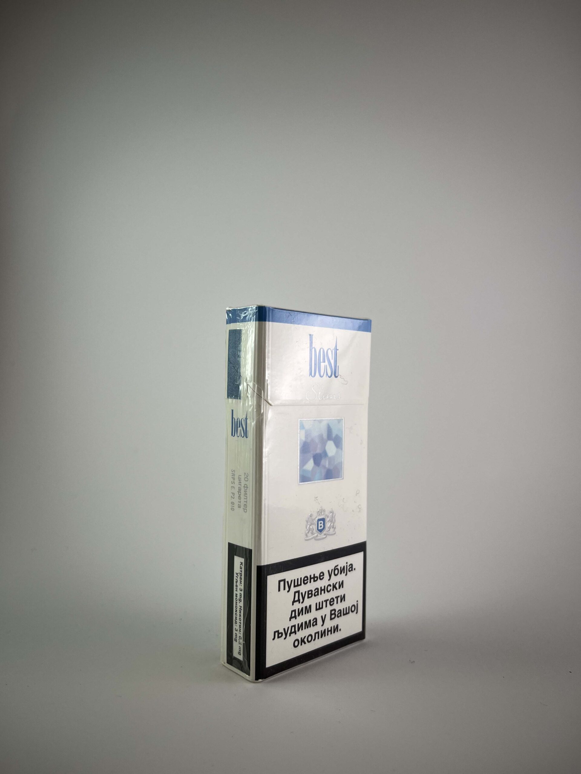 Aprašymas: Šis „Best Slims“ cigarečių pakelis pasižymi minimalistiniu ir moderniu dizainu, orientuotu į eleganciją ir subtilumą. Pakuotės dizainas yra šviesiai mėlynos spalvos su geometriniais motyvais, suteikiančiais subtilumo. Įspėjimas apie rūkymo žalą užima didelę pakuotės dalį, pabrėždamas gaminio sveikatos rizikas. Šie cigaretės labiau orientuotos į moterų auditoriją dėl plonos formos ir elegantiško dizaino.