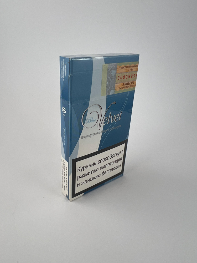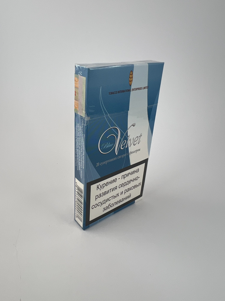 Šis „Blue Velvet“ cigarečių pakelis iš Azerbaidžano pasižymi moderniu ir vizualiai patraukliu dizainu, vyraujančios mėlynos spalvos tonai derinami su šviesesniu vertikaliu dryžiu ir stilizuotu logotipu. Priekinėje dalyje nurodyta, kad tai „superthin“ cigaretės su filtru. Pakelis turi aiškiai matomą azerbaidžanietišką akcizo lipduką. Įspėjimai apie rūkymo žalą pateikti rusų kalba, o tai rodo orientaciją į NVS rinkas. Pakuotė – užklijuota, neišpakuota, su originalia apsaugine plėvele.