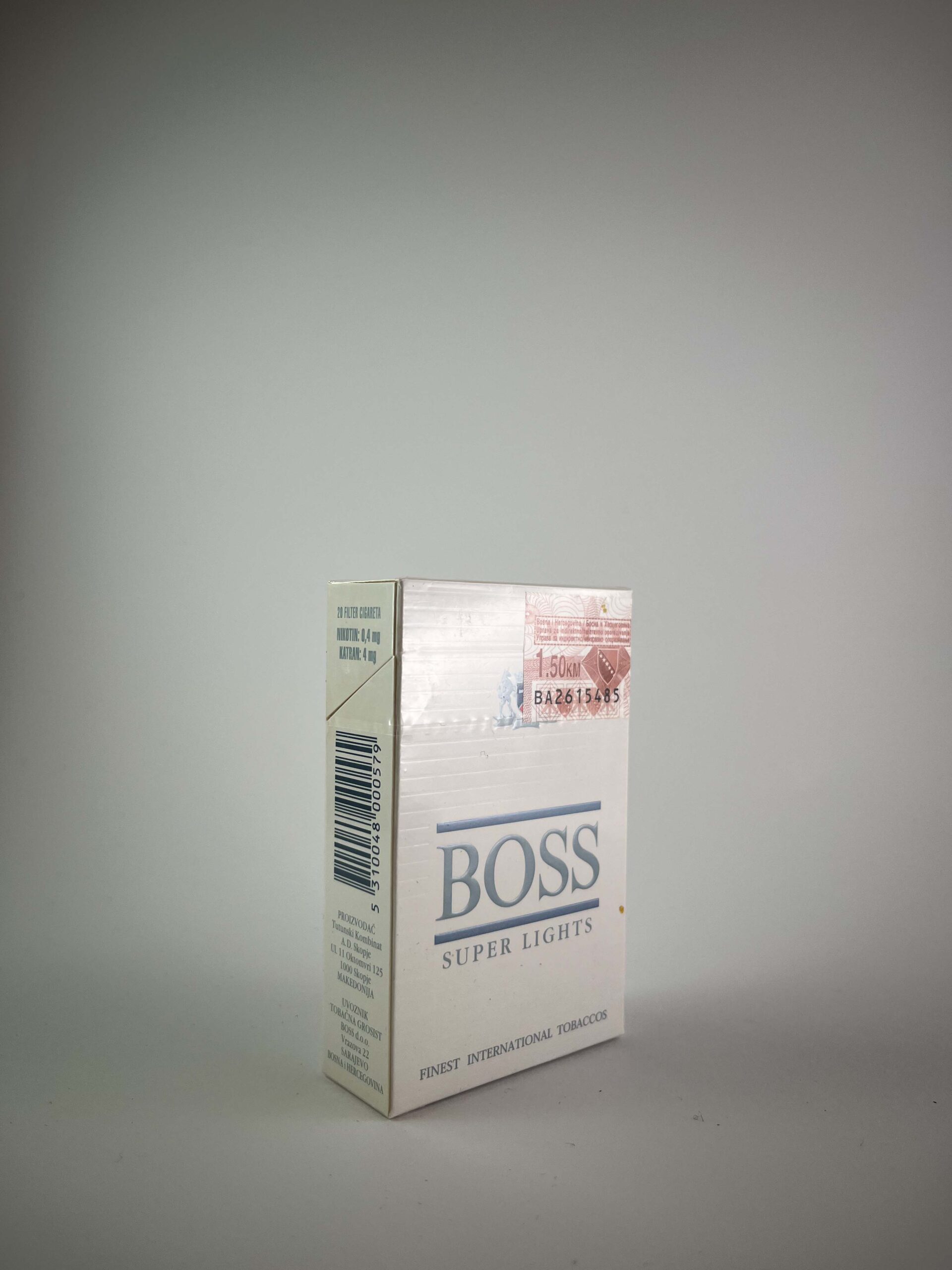 Boss „Super Lights” cigarečių pakelis pasižymi elegantišku baltu dizainu su šviesiai mėlynomis detalėmis. Prekės ženklas yra subtiliai išryškintas, o minimalistinis stilius atspindi pakelio „lengvą“ charakterį. Ant pakuotės aiškiai pažymėti sveikatos įspėjimai ir mokesčių ženklai, atspindintys rinkos reglamentus. „Super Lights“ pavadinimas signalizuoja apie švelnesnį tabako mišinį, skirtą vartotojams, ieškantiems mažesnio stiprumo cigarečių.