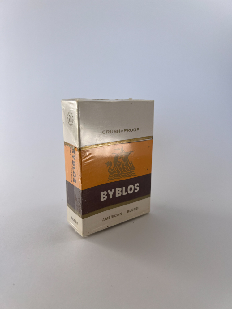 BYBLOS – tai reta cigarečių rūšis, pavadinta pagal senovinį Finikijos miestą Byblos (dab. Jbeil, Libanas). Šis pakelis pasižymi klasikinio stiliaus dizainu su rudai-oranžiniu atspalviu ir antikine simbolika, rodančia laivo motyvą – greičiausiai nuoroda į Finikijos paveldą. Ant pakuotės aiškiai nurodyta „CRUSH-PROOF“ – tai reiškia, kad tai sustiprintas kietas pakelis, o tokie pavyzdžiai iš 1980–1990 m. laikotarpio dabar pasitaiko gana retai. Naudotas „American Blend“ tabakas rodo, kad tai buvo skirtas eksportui arba pasiturinčiai vietinei rinkai.