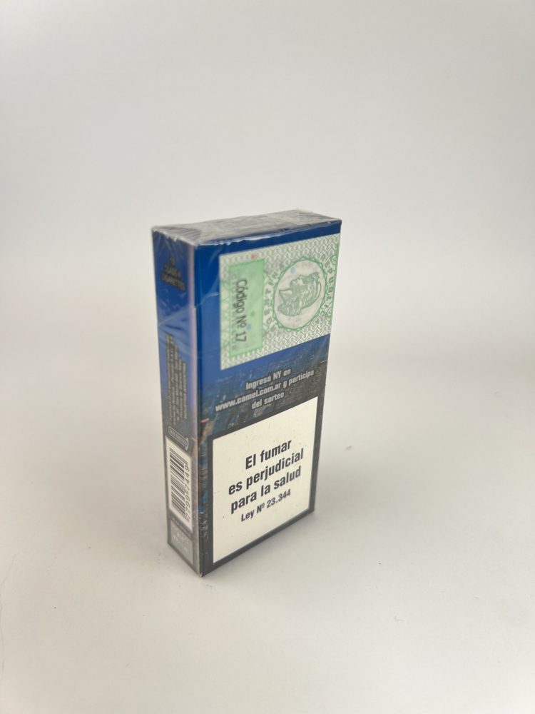 Viršuje – logotipas Camel Genuine NY baltomis raidėmis mėlyname dangaus fone, o šone – Argentinos akcizo juosta ir nuoroda į camel.com.ar.