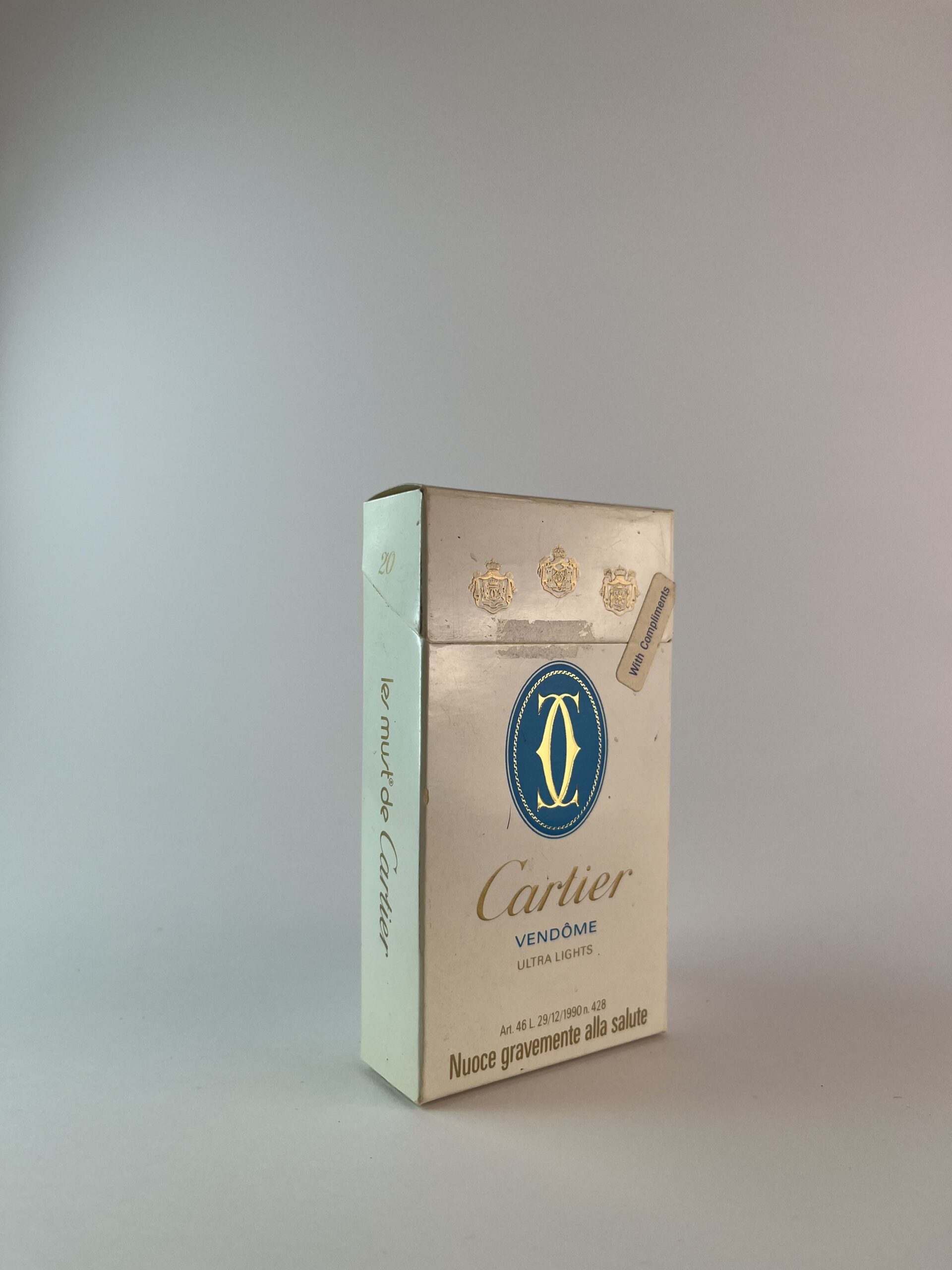 Aprašymas: Šis „Cartier Vendôme Ultra Lights” cigarečių pakelis išsiskiria elegantišku ir prabangiu dizainu, būdingu Cartier prekės ženklui. Pakuotė yra su subtiliais aukso akcentais ir išraiškingu prekės ženklo logotipu, kuris simbolizuoja aukštą klasę ir stilingumą. Ant pakelio yra įspėjimas apie rūkymo žalą, įprastas moderniems tabako gaminiams.