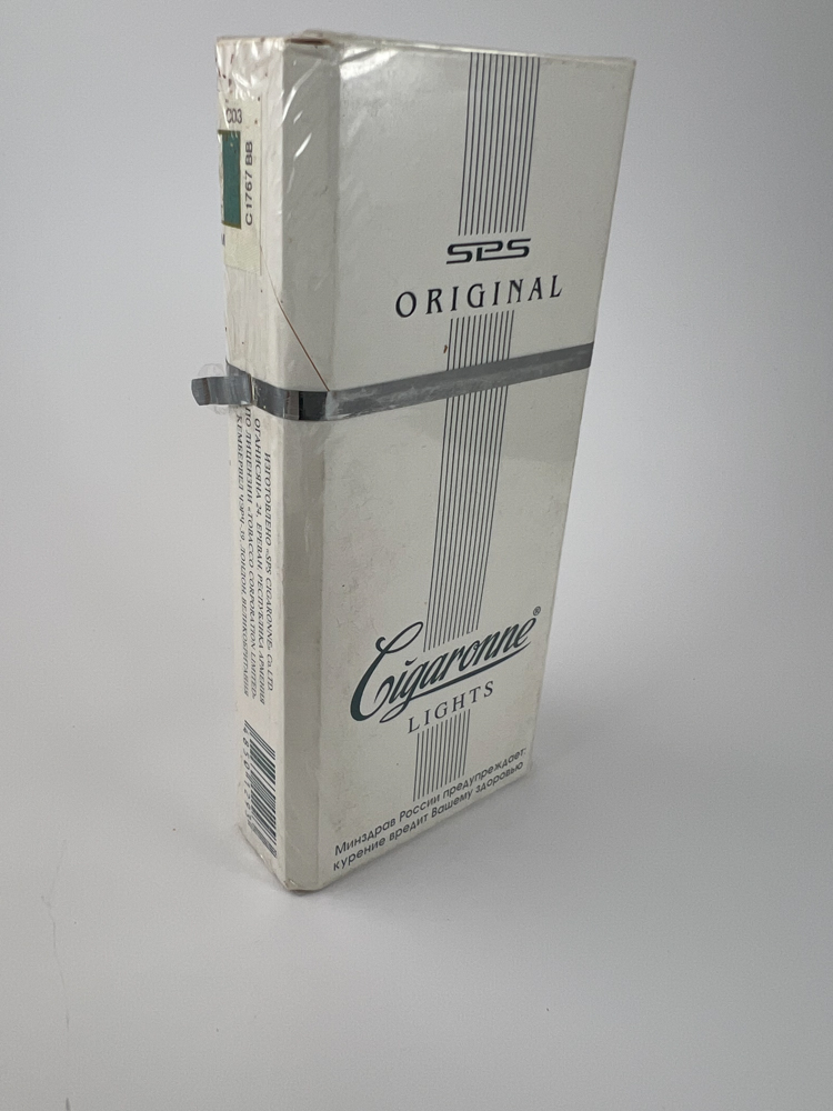 Šis „Cigarone Lights SDS Original“ pakelis pasižymi elegantišku minimalistiniu dizainu – baltas fonas derinamas su sidabrinėmis vertikaliomis linijomis ir sidabrine juostele per pakelio vidurį. Šis modelis priklauso „SDS Original“ linijai, gamintai Armėnijoje. Įspėjimai apie rūkymo žalą pateikti rusų kalba, o viršuje matomas rusakalbių šalių (NVS) akcizo lipdukas. Ant pakelio nurodyta, kad cigaretės turi „filter holder“ – tai išskirtinis Cigarone bruožas, kai filtras įtvirtintas per ilgą kandiklį. Pakuotė yra originali, nepažeista, su gamykline plėvele.