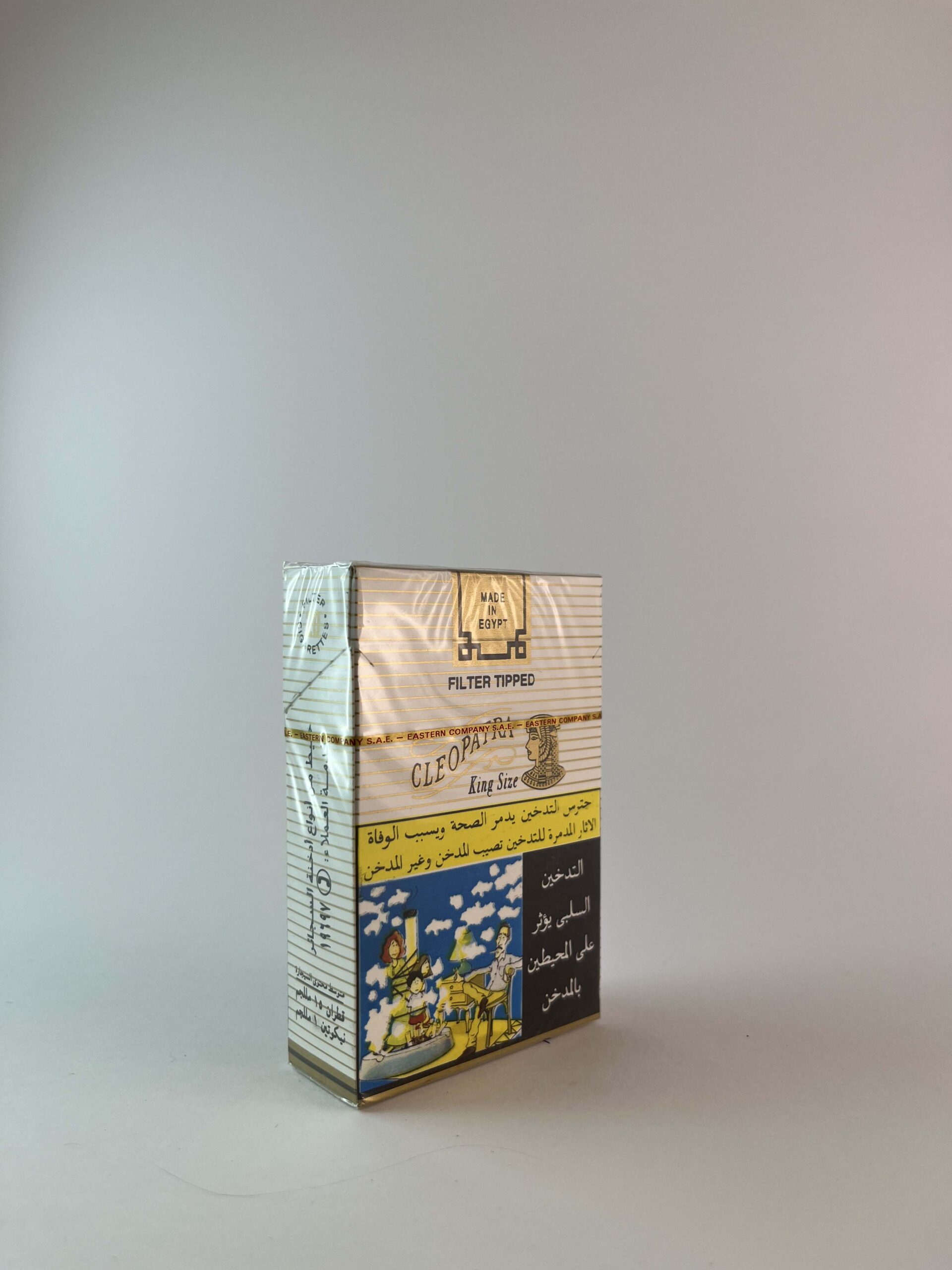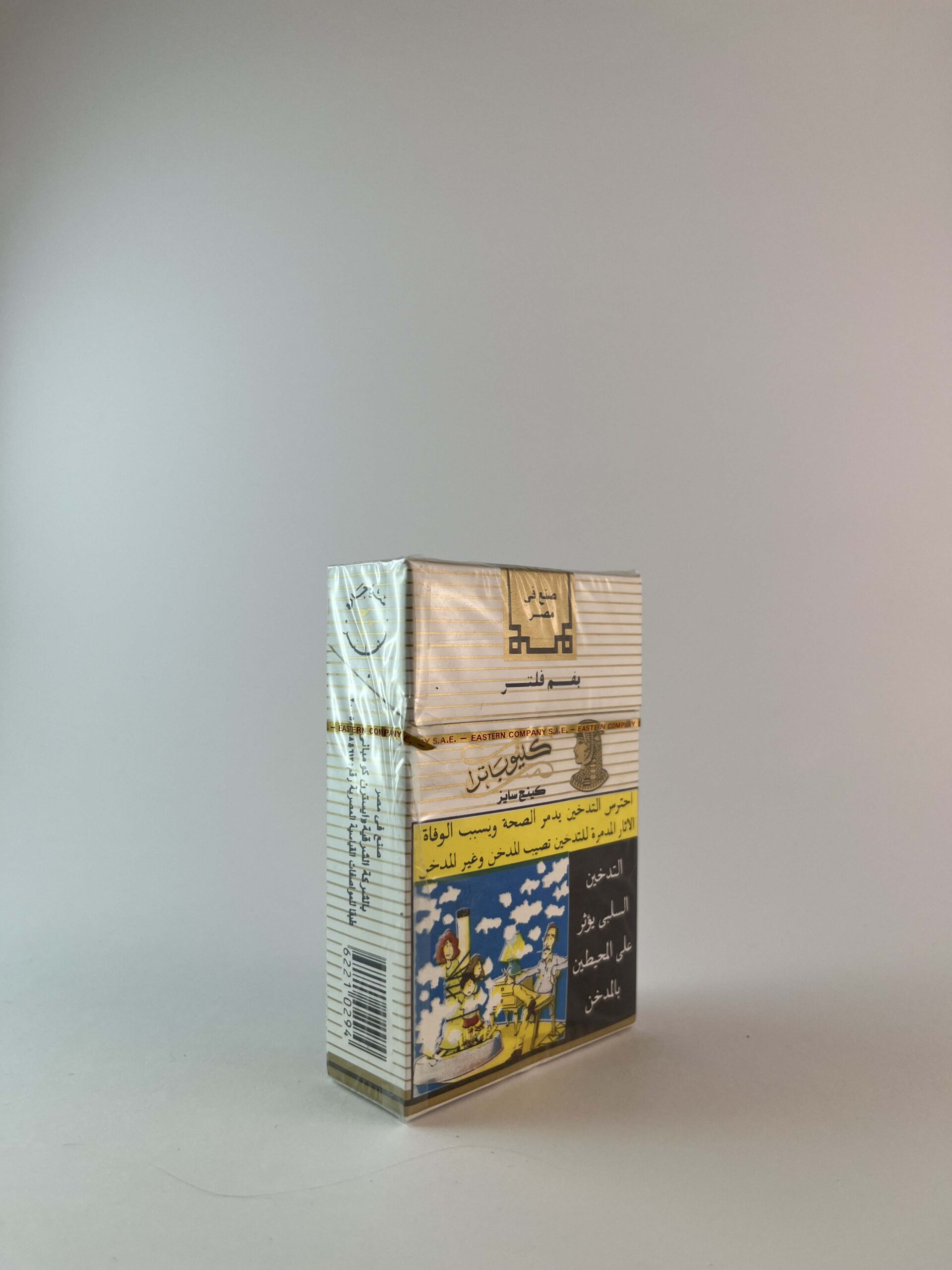 Aprašymas: Šis Cleopatra cigarečių pakelis yra skirtas Egipto rinkai, pasižymintis klasikiniu dizainu su karalienės Kleopatros atvaizdu. Pakelis turi vidutinio storio juosteles, o apatinėje dalyje yra spalvotas piešinys, vaizduojantis Egipto kultūrinį paveldą ir tradicijas. Įspėjimas apie rūkymo žalą pateikiamas arabiškai, o pats pakelis turi tradicinį „King Size“ dydį.