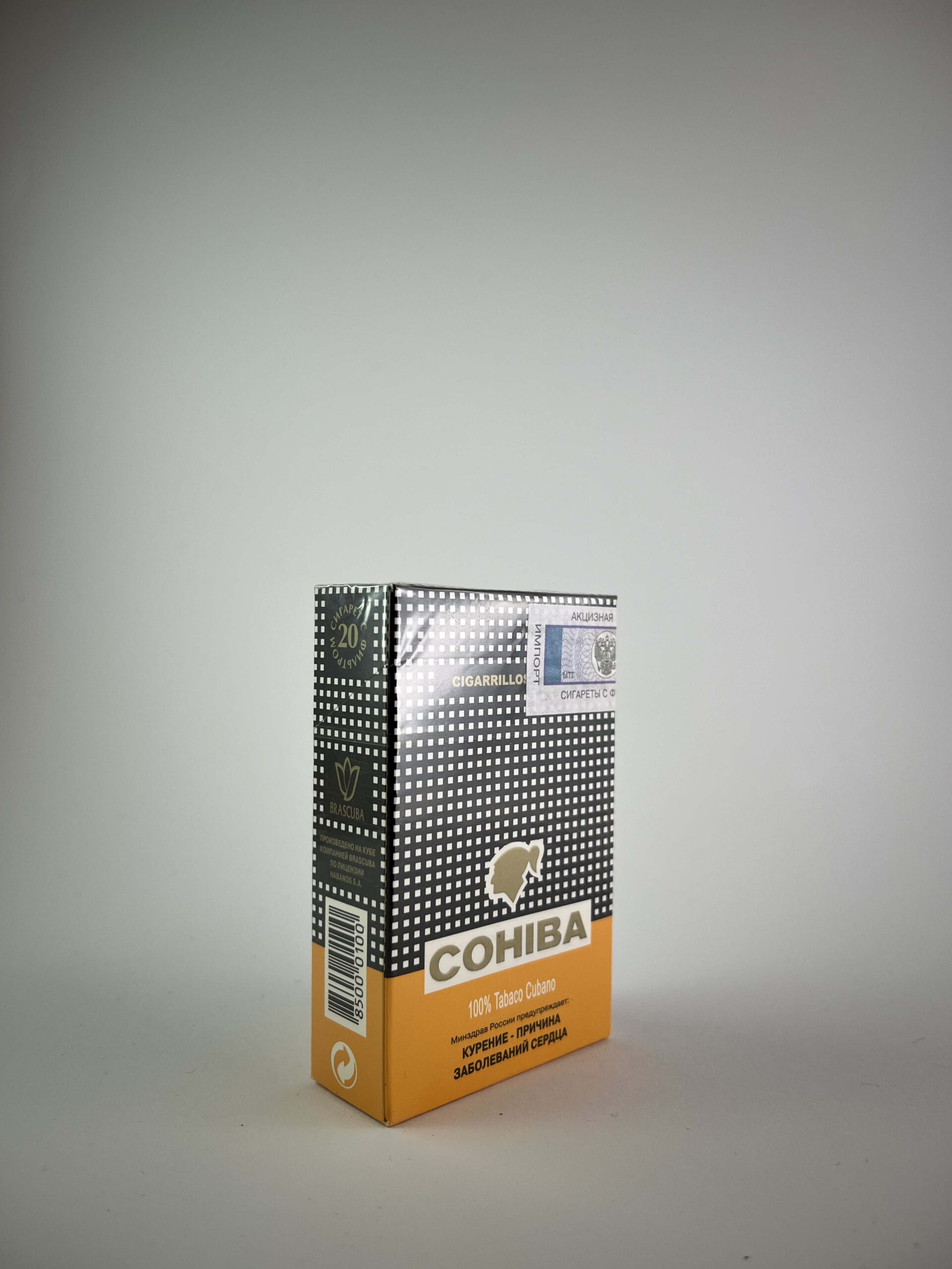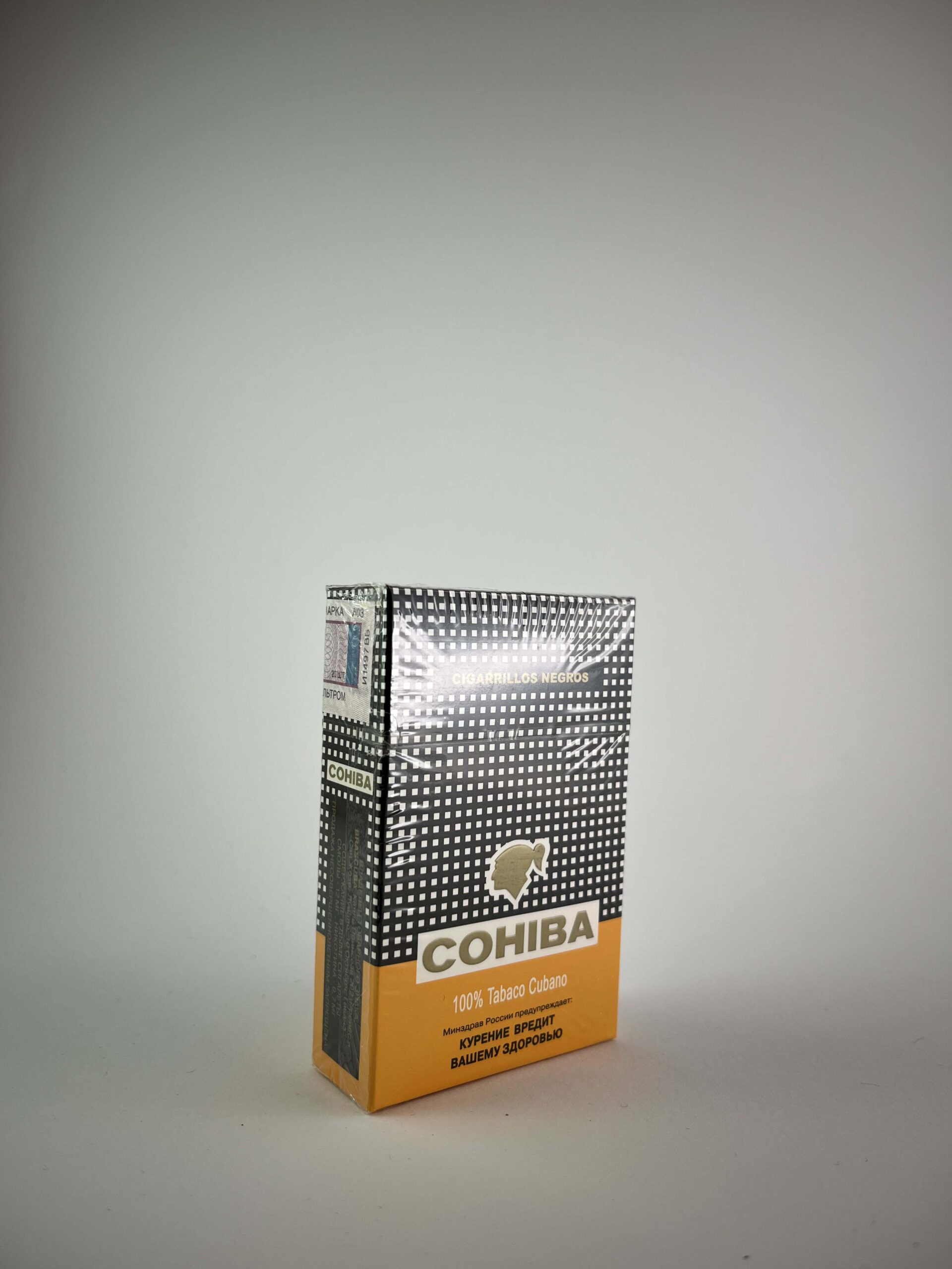Aprašymas: Cohiba „Cigarillos Negros” – tai gerai žinomo kubietiško tabako prekės ženklo produktas, kuris garsėja savo aukštos kokybės cigarais. Pakelio dizainas išsiskiria klasikinėmis juodos ir geltonos spalvų kombinacijomis su baltu taškuotu raštu – tai išskirtinis Cohiba prekės ženklo bruožas. Pakelis puikios būklės, neatidarytas, ant jo aiškiai matomi Rusijos rinkos akcyziniai ženklai bei rusiški perspėjimai dėl rūkymo žalos.