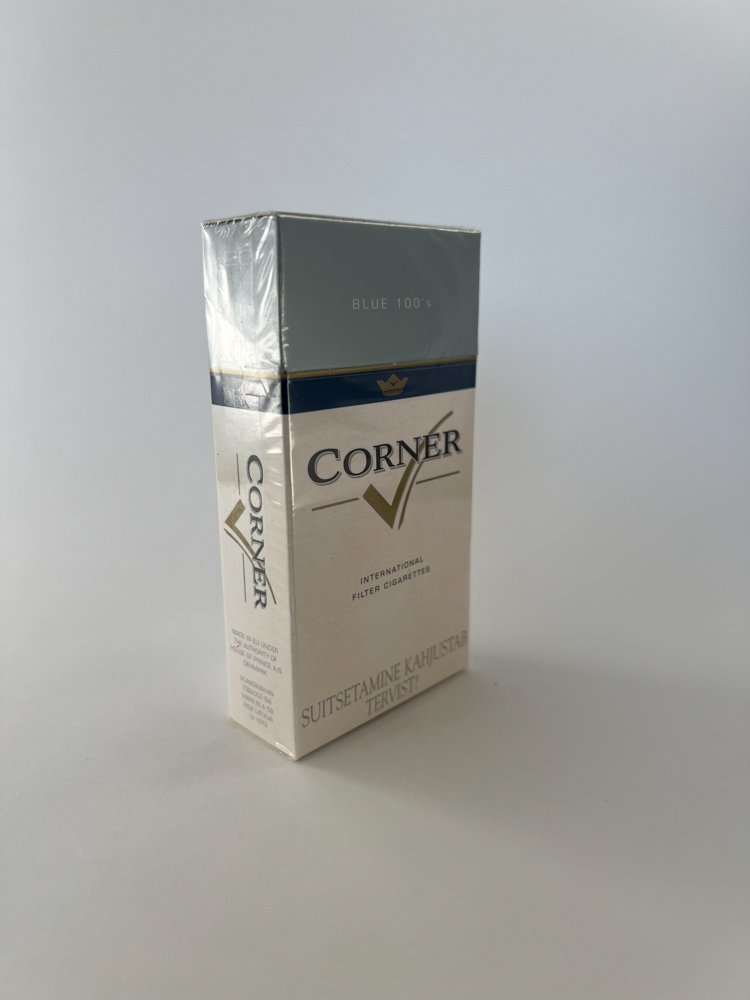 „Corner Blue 100’s“ yra vienas iš biudžetinių tarptautinių cigarečių prekių ženklų, orientuotų į Europos rytines ir Baltijos šalis. Pakelis pasižymi minimalistiniu dizainu: viršutinėje dalyje – šviesiai mėlyna spalva su užrašu „BLUE 100’s“, o pagrindinė dalis – šviesiai kreminė su logotipu „Corner“ ir auksiniu varnele pažymėtu simboliu. Apatinėje dalyje matomas užrašas estų kalba: „Suitsetamine kahjustab tervist“ („Rūkymas kenkia sveikatai“), o viršuje – Estijos akcizo ženklas.