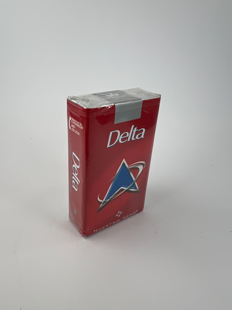 Šis „Delta“ cigarečių pakelis pasižymi raudonu fonu ir futuristiniu logotipu, primenančiu stilizuotą delta simbolį su mėlynos spalvos trikampiu ir metalizuotu žiedu. Priekinėje dalyje matomas šūkis „Nuestro Sabor“ (mūsų skonis), o galinėje pusėje pateiktas didelis sveikatos įspėjimas ispanų kalba apie rūkymo keliamą pavojų nėštumui, širdžiai ir plaučiams. Šoninėse dalyse nurodyta kontaktinė informacija bei gamintojas – „Tabacos Bolivianos“. Pakelis yra originaliame celofane, nepažeistas, su Bolivijos akcizine juostele.