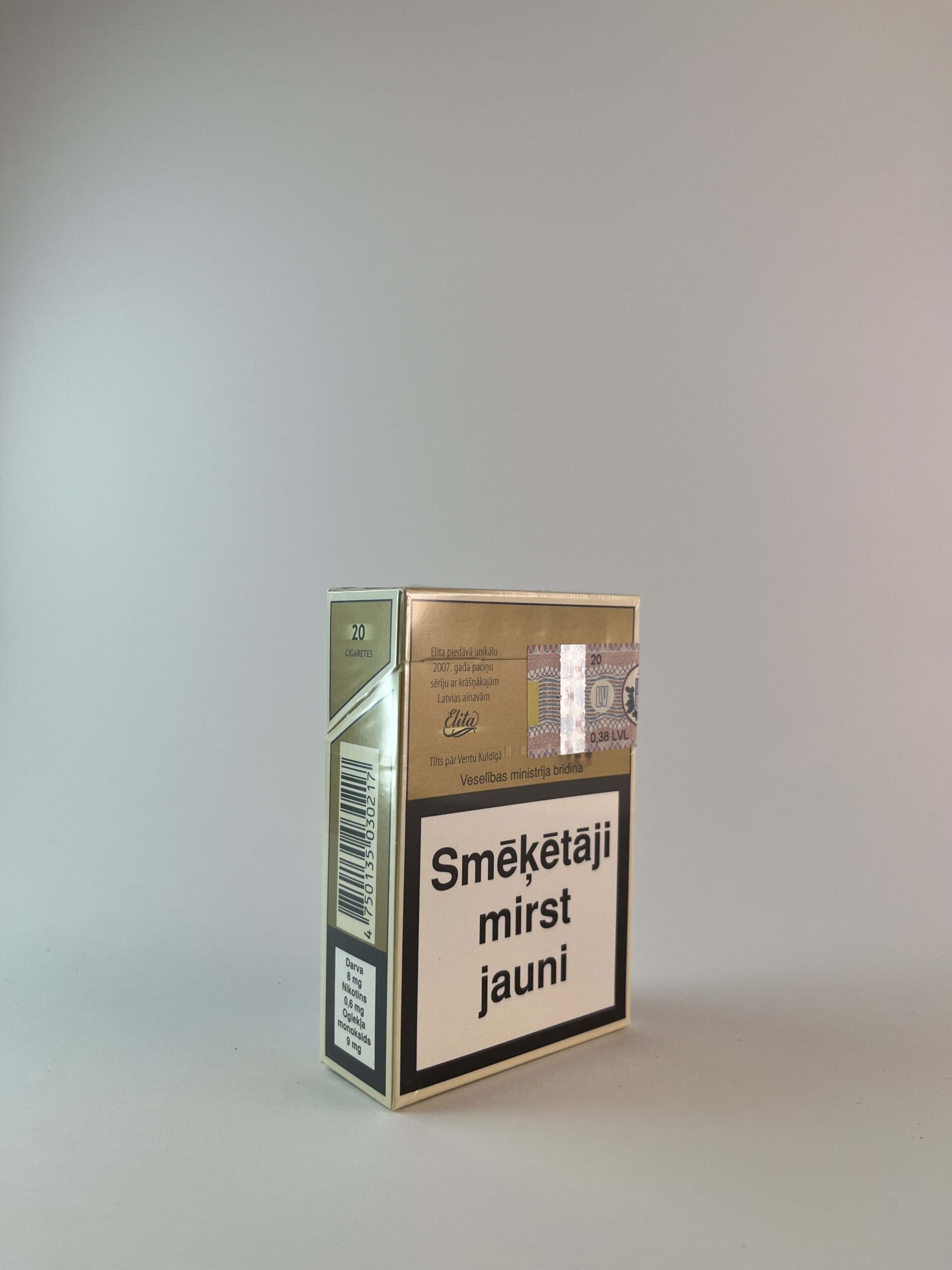 Aprašymas: Elita Gold cigarečių pakelis yra elegantiško dizaino, pagrindinėje dalyje dominuoja aukso spalva, kuri suteikia prabangos pojūtį. Ant pakuotės matomas Latvijos istorinio paminklo motyvas, kas suteikia pakeliui ypatingą nacionalinį akcentą. Sveikatos įspėjimai yra latvių kalba ir pateikiami aiškiai matomoje vietoje, įspėjant apie rūkymo riziką sveikatai. Šis pakelis skirtas Latvijos rinkai, ir jo dizainas atspindi Latvijos kultūrinį identitetą.