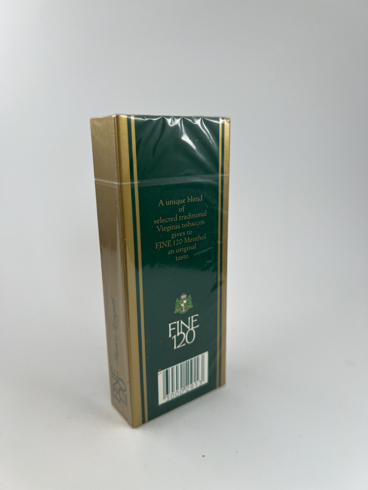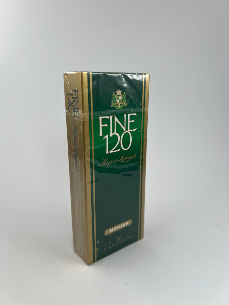 „Fine 120 Menthol“ – tai išskirtinio dizaino ilgo formato cigarečių pakelis su tamsiai žaliu fonu ir auksinėmis detalėmis. Viršutinėje dalyje matomas herbinis logotipas, simbolizuojantis kokybę ir klasikinį stilių. Pakelis akcentuoja „Super Length“ – 120 mm cigarečių formatą, o apatinėje dalyje paminėta, kad tai yra filtruotos mentolio cigaretės. Galinėje dalyje pateikta reklaminė frazė apie tradicinio Virginijos tabako mišinį. Dizainas perteikia premium kategorijos įspūdį, būdingą Azijos rinkai.