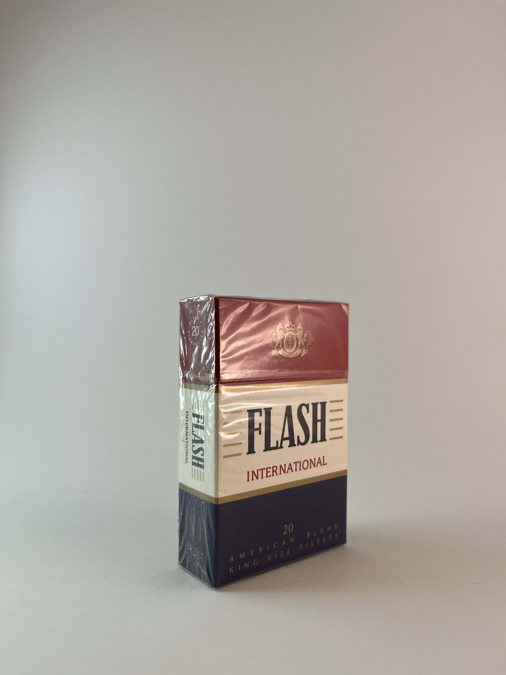 Aprašymas: Šis „Flash International“ cigarečių pakelis yra elegantiško ir klasikinio dizaino su raudona ir kreminėmis spalvomis, kurias papildo aukso akcentai. Pakelio viršuje esantis logotipas sukuria prabangos įspūdį. Tai klasikinio „American Blend“ tipo cigaretės su filtrais. Įspėjimas apie rūkymo žalą pateikiamas aiškiai, kaip yra reikalaujama šiuolaikinėse rinkose.