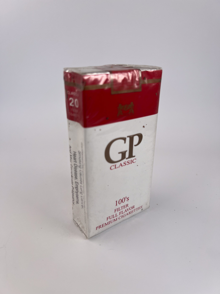 „GP Classic“ – santūraus, tačiau klasikinio dizaino amerikietiškas cigarečių pakelis, išsiskiriantis kontrastingu baltos ir sodriai raudonos spalvų deriniu. Viršutinė dalis – tamsiai raudona su auksiniu rėmeliu ir herbu, perteikiančiu tradicinio premium segmento įvaizdį. Centre – didelės raidės GP, spausdintos metalizuotu auksiniu šriftu, o po jomis užrašas Classic, papildantis visumą solidumu. Apatinėje dalyje – informacinis tekstas „100’s Filter Full Flavor Premium Cigarettes“, nusakantis pailgintą cigarečių formatą ir pilno skonio charakterį. Šoninėse pakelio pusėse matomas „Surgeon General’s Warning“, būdingas JAV tabako gaminiams. Dizainas primena 1980–1990 m. „Marlboro“ eros estetiką, kai siekta aiškaus, ryškaus, bet neperkrauto vizualinio identiteto.