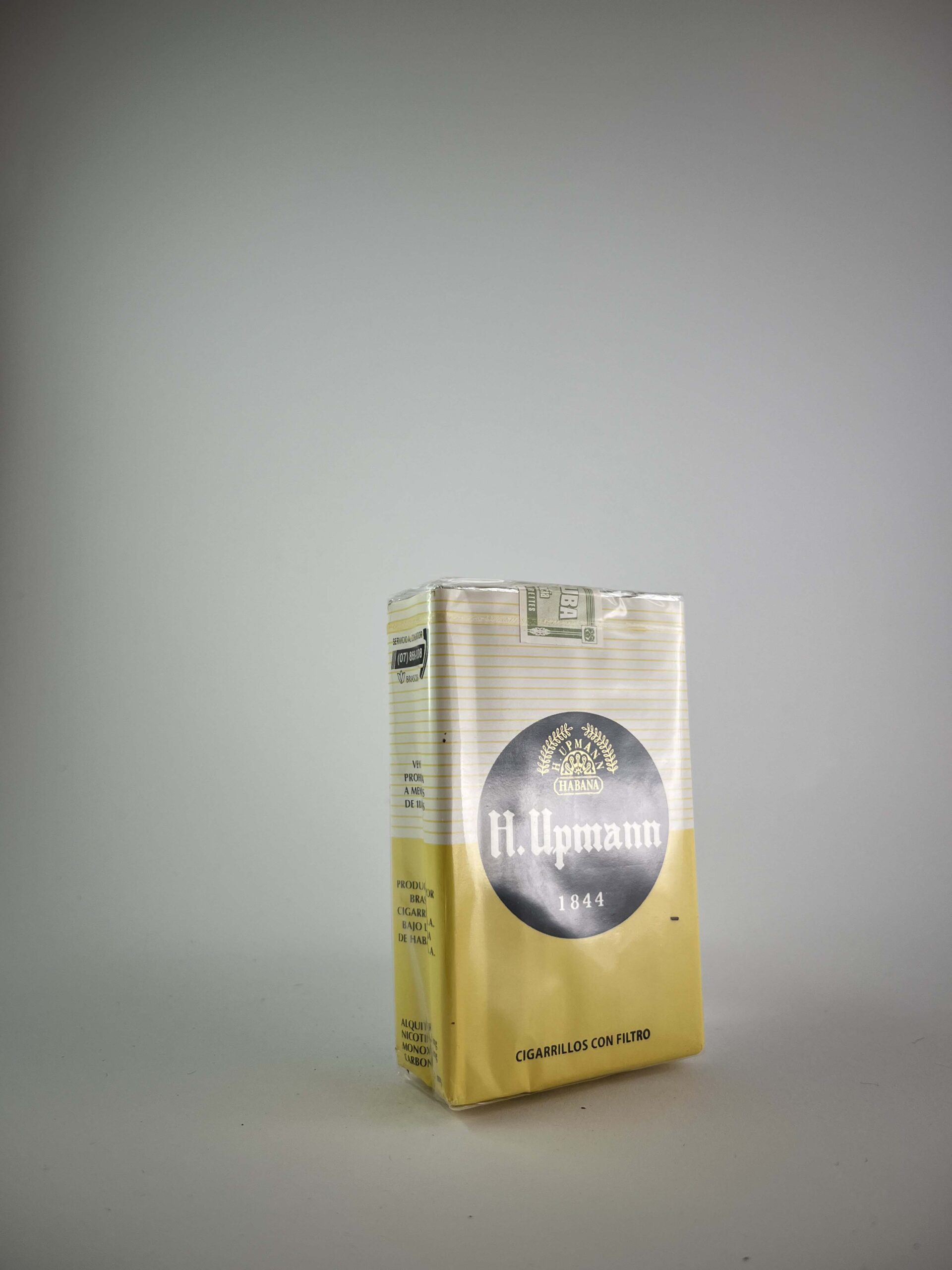 Aprašymas: Šis H. Upmann 1844 cigarečių pakelis yra klasikinio ir tradicinio dizaino, pasižymintis gelsvais ir juodais akcentais. Pakelyje išryškintas prekės ženklas „H. Upmann“ ir gamybos metai – 1844, pabrėžiant ilgalaikę kokybės tradiciją. Informaciniai sveikatos įspėjimai aiškiai matomi ant pakelio. Tai kolekcinis gaminys, kuris išsiskiria savo paprastu, tačiau solidžiu dizainu.