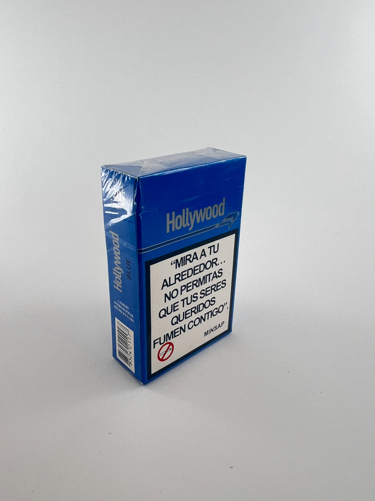 Aprašymas: Hollywood Blue cigarečių pakelis pasižymi intensyvia mėlyna spalva su metaliniu blizgesiu. Priekinėje ir galinėje dalyje matomi griežti įspėjimai ispanų kalba, skirti Kubos vartotojams – tai rodo, kad pakelis skirtas būtent Kubos rinkai. Galinėje dalyje esantis tekstas iš MINSAP (Kubos sveikatos apsaugos ministerijos) sustiprina šią prielaidą. Vizualiai pakelis modernus, minimalistinio dizaino, su ryškiu „Hollywood” logotipu ir kampiniu grafiniu elementu. Pakelis neatidarytas, puikios būklės.