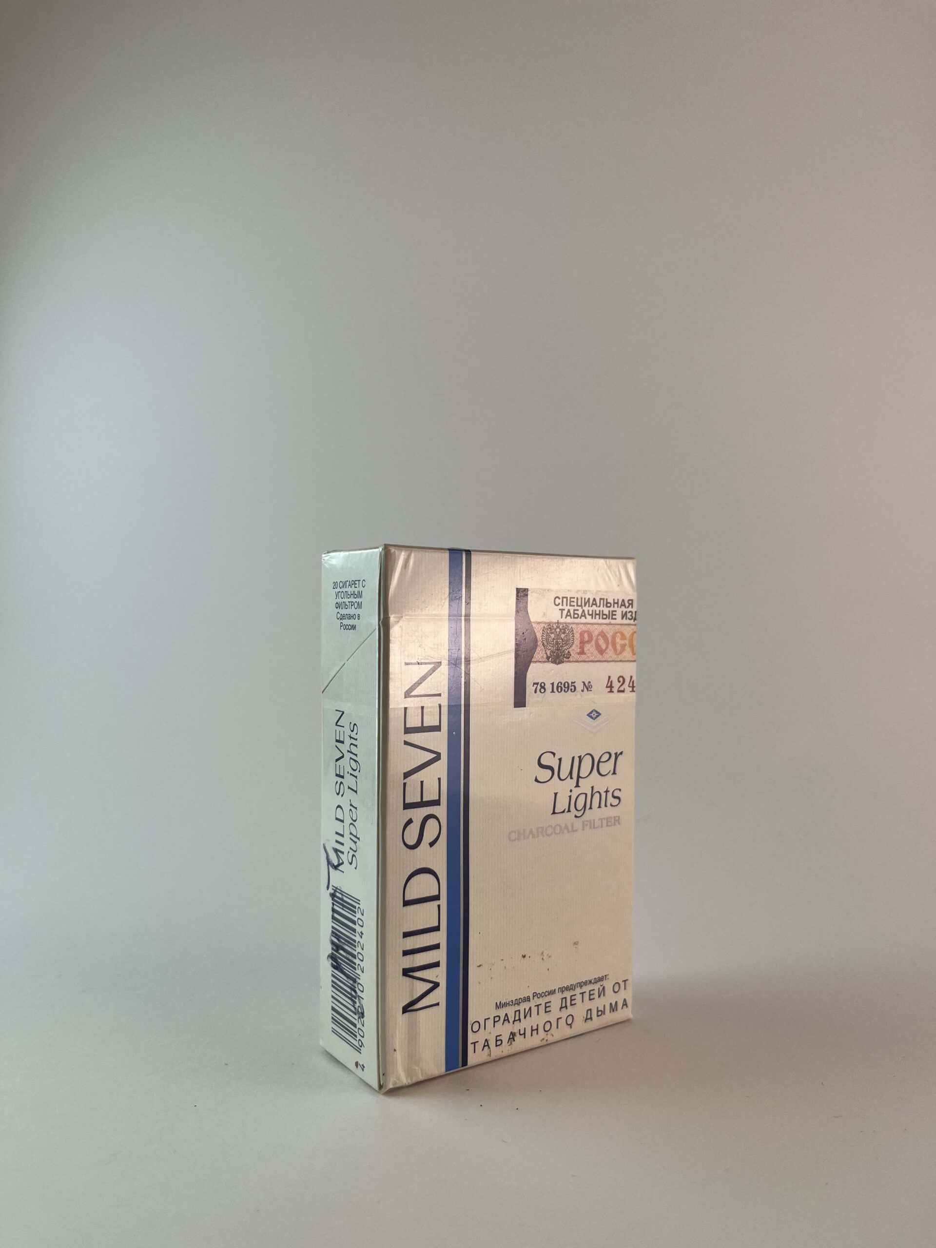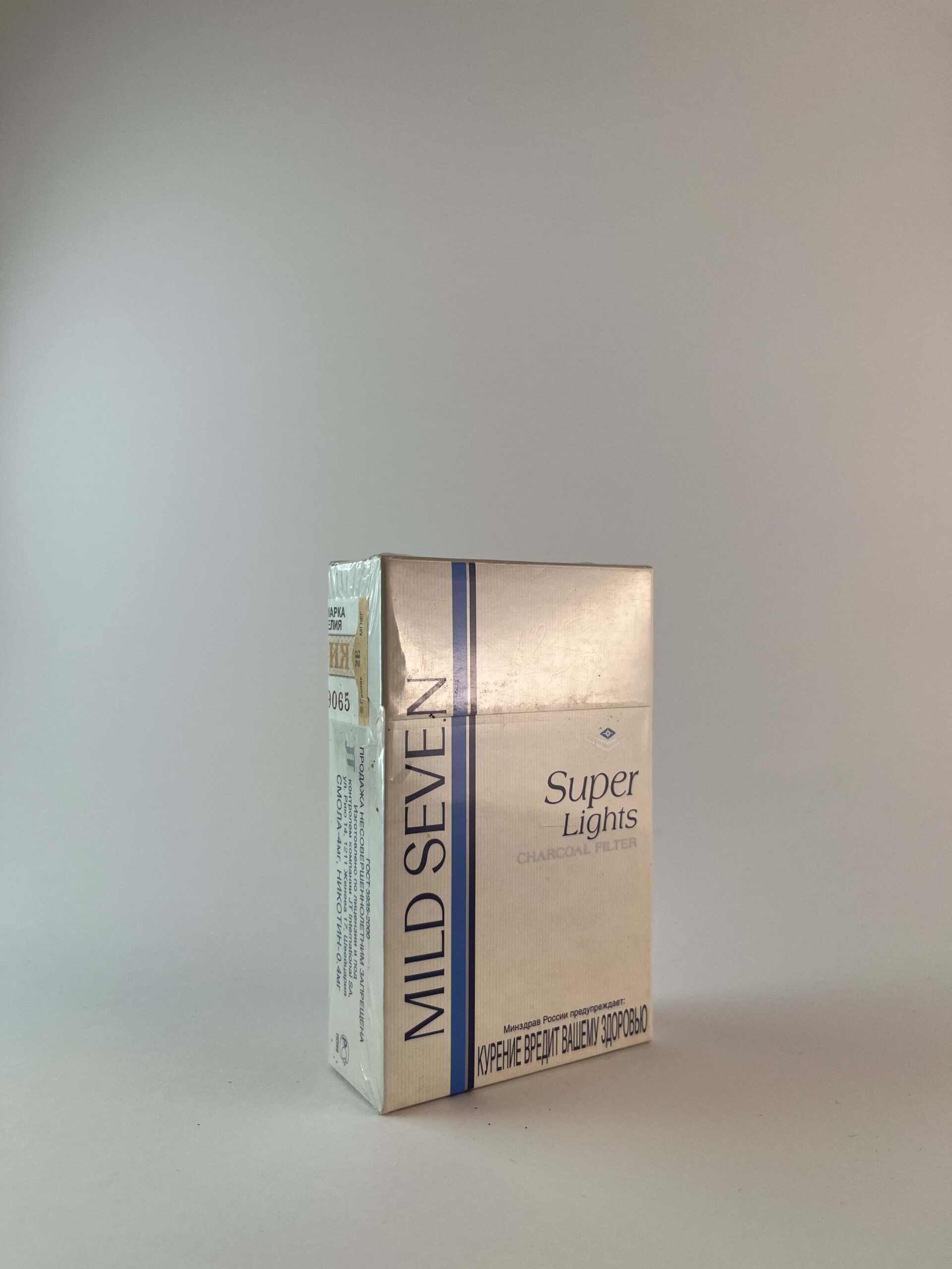 Aprašymas: Mild Seven „Super Lights“ cigarečių pakelis pasižymi švelnia ir minimalistine spalvų palete, kurioje dominuoja balta ir mėlyna spalvos. Pakuotėje aiškiai išryškintas pavadinimas, pabrėžiant cigarečių švelnumą su „Charcoal Filter“ funkcija, skirta pagerinti rūkymo patirtį. Įspėjimas apie rūkymo žalą yra pateiktas rusų kalba, atspindintis produktą skirtą Rusijos rinkai. Mild Seven yra žinomas dėl savo kokybės ir išskirtinumo Azijos bei tarptautinėse rinkose.