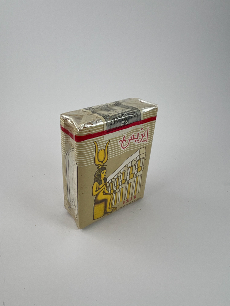 Aprašymas: Šis „ISIS“ cigarečių pakelis turi aiškią egiptietišką tematiką – pakelio priekyje vaizduojama senovės Egipto deivė Izidė (Isis), o foną sudaro klasikinės egiptietiškos kolonos. Pavadinimas parašytas tiek arabiškais, tiek lotyniškais rašmenimis. Viršutinėje dalyje – raudona juostelė ir Egipto muitinės žyma, patvirtinanti, kad tai eksportinis ar oficialiai kontroliuotas gaminys. Pakelis yra neatidarytas, su apsaugine plėvele, tačiau pastebimi amžiaus ženklai – paviršiaus dėmės ir pakraštėlių pasitrynimas.