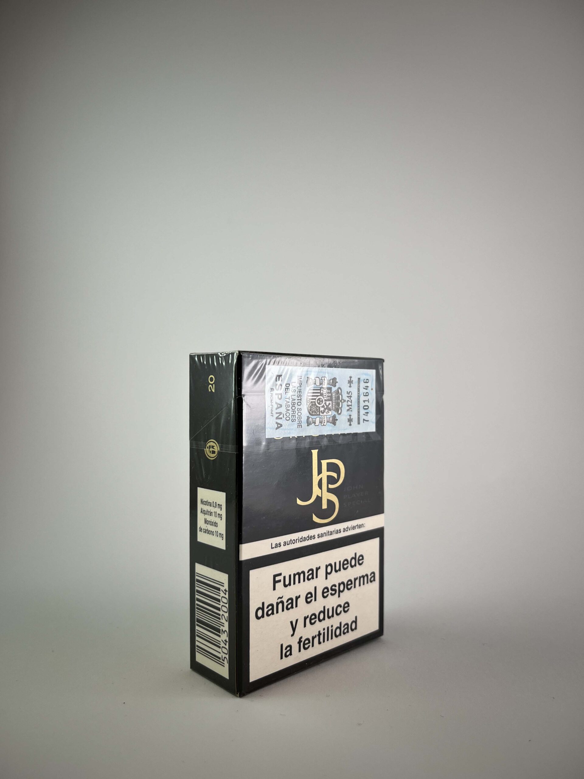 Aprašymas: Šis JPS „Original” cigarečių pakelis yra solidus ir elegantiškas, pasižymintis tamsiu spalvų deriniu ir auksiniu logotipu, kuris atspindi prekės ženklo išskirtinumą. Pakuotės priekyje ir gale yra ryškiai pateikti sveikatos įspėjimai ispanų kalba, kurie pabrėžia rūkymo žalą. Antspaudas ir išspausdinta informacija aiškiai rodo, jog pakelis skirtas Ispanijos rinkai.