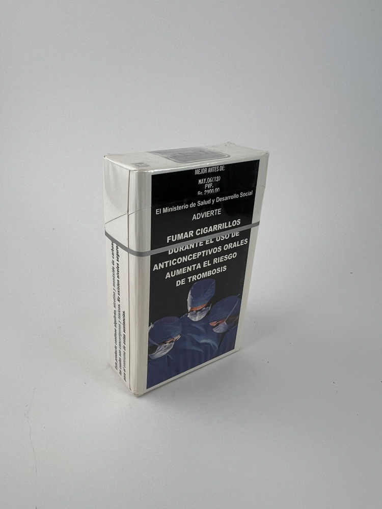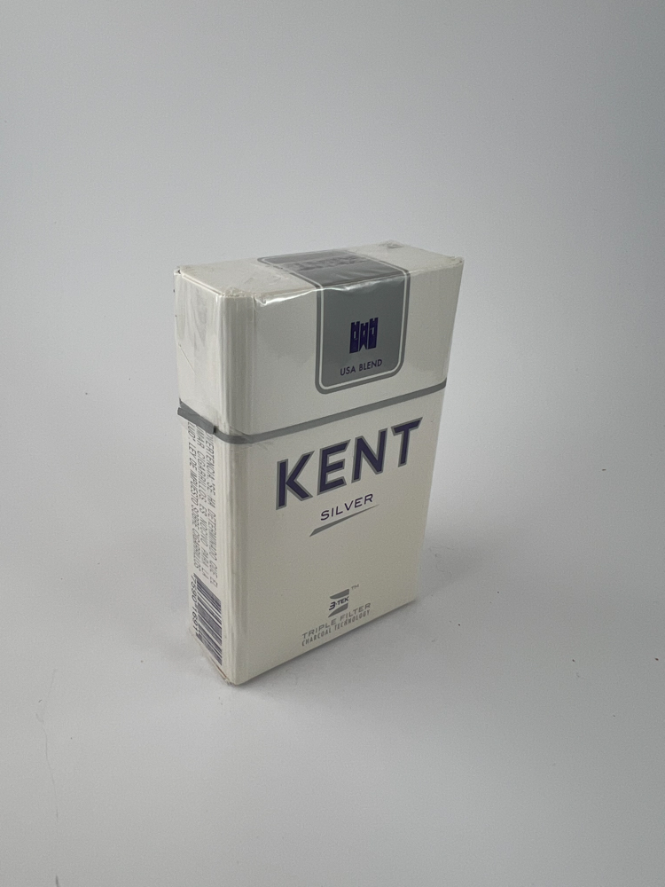 Aprašymas: Šis „Kent Silver USA Blend“ cigarečių pakelis pasižymi minimalistiniu baltu dizainu su mėlynu logotipu ir pabrėžimu „USA Blend“, nurodančiu amerikietiško tipo tabako mišinį. Apatinėje dalyje nurodyta, kad tai „Triple Filter Charcoal Technology“ – būdingas Kent filtrų bruožas. Nugarinėje pusėje – įspėjimas ispanų kalba iš Venesuelos Sveikatos ir socialinės apsaugos ministerijos su nuotrauka ir tekstu apie padidėjusią trombozės riziką naudojant kontraceptikus. Tai aiškiai patvirtina, jog pakelis skirtas Venesuelos rinkai.