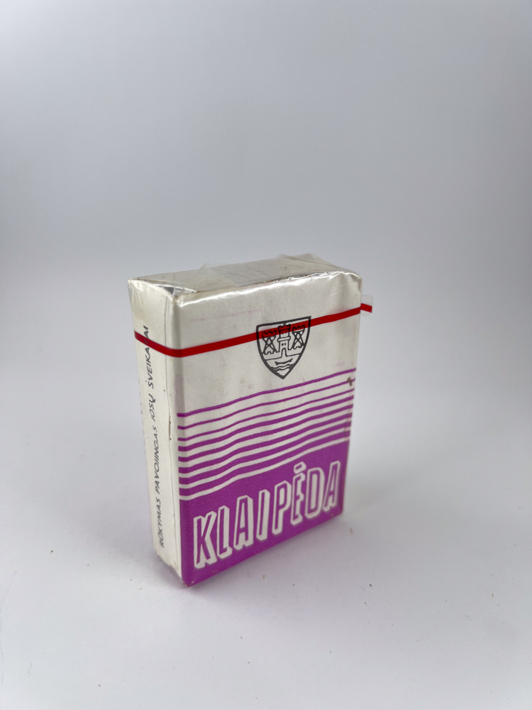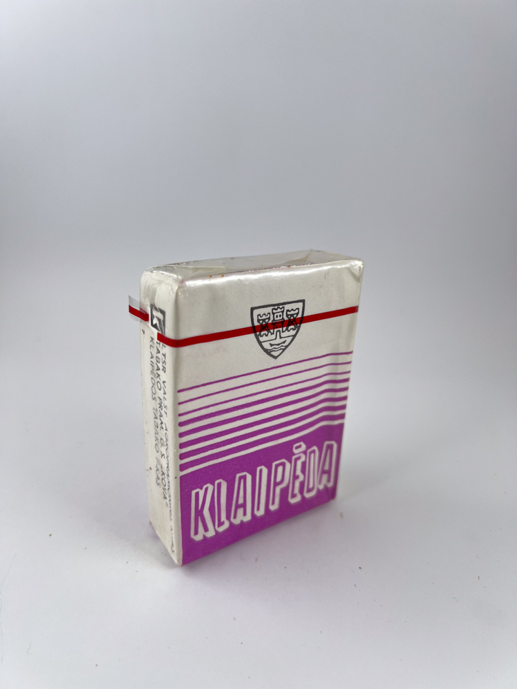 Šone nurodyta: „Lietuvos TSR, Klaipėdos tabako fabrikas“, o priešingoje pusėje – tipiškas laikotarpio įspėjimas „Rūkymas pavojingas jūsų sveikatai“.