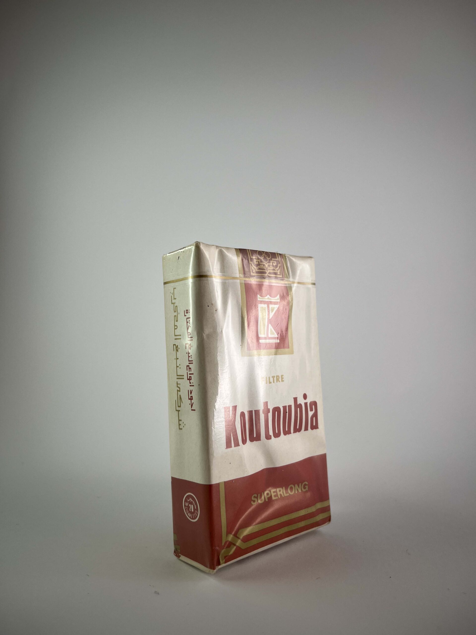 Aprašymas: Šis „Koutoubia Superlong“ cigarečių pakelis pasižymi unikalia marokietiška estetika su subtiliais arabų kalbos akcentais. Dizainas yra paprastas, su baltos ir raudonos spalvų deriniu. Pakelyje yra užrašas „Filtre“, pabrėžiantis filtrines cigaretes, taip pat „Superlong“, nurodantis išskirtinai ilgą cigarečių formatą. Originali pakuotė yra nepažeista, tačiau matyti lengvas nusidėvėjimas, būdingas senesniems gaminiams.