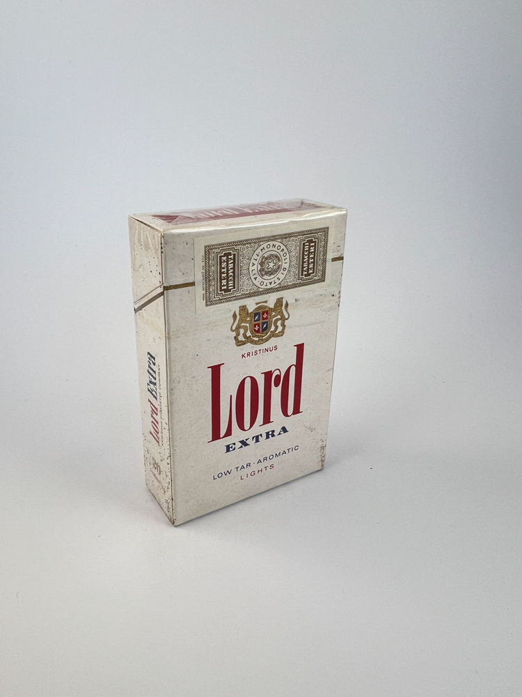 Aprašymas: Šis „Lord Extra“ cigarečių pakelis su užrašu „Kristinus“ priklauso senesnei „Lights“ versijai. Pakelis baltos spalvos, dekoruotas auksiniu herbu ir klasikiniu šriftu. Apačioje nurodyta „Low Tar, Aromatic Lights“, kas būdinga lengvesnėms cigaretėms iš XX a. pabaigos. Ant viršaus išlikęs originalus Vengrijos monopolio ženklas (Magyar Dohány Monopólium), rodantis, kad pakelis skirtas vietinei rinkai prieš privatizacijos ir dereguliacijos bangą. Būklė šiek tiek paveikta laiko, tačiau pakelis neatidarytas.